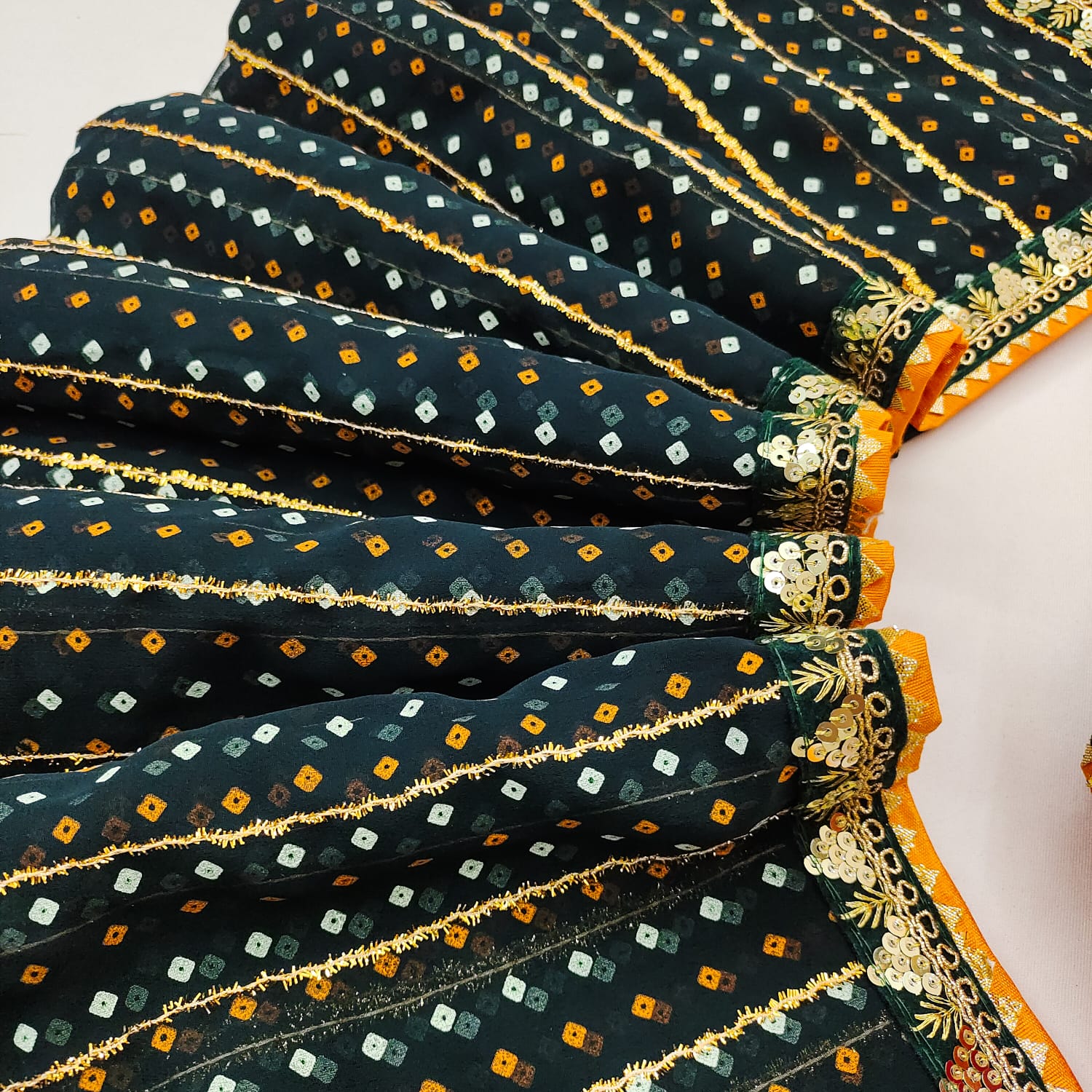 - Fabric Detail: Saree : Georgette Blooming Sequence With Zari Border Bandhej Print , Blouse : Banglori Silk, ,