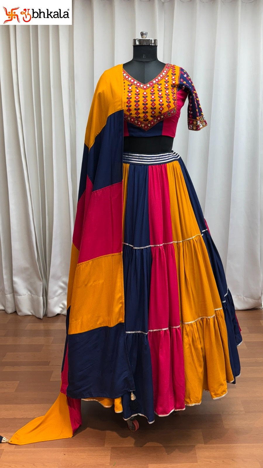 - Fabric Detail: Lehenga : Viscose Cotton Frill And Flair Concept Stitching Pattern, Length : 40 Apx, Waist : 42 Apx, Flair : 10 Mtr , Blouse : Viscose Cotton Kutchi Patch Work With All Over Mirror, Length : 15 Apx, Chest : 38 Apx M Size Stitched With Customis Up To 44 Inch , Dupatta : Viscose Cotton Multi Colour Patch Work, Cut : 2.40 Mtr ,