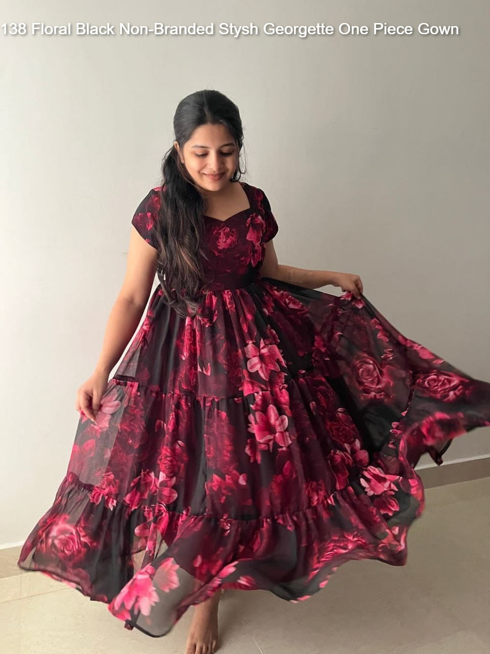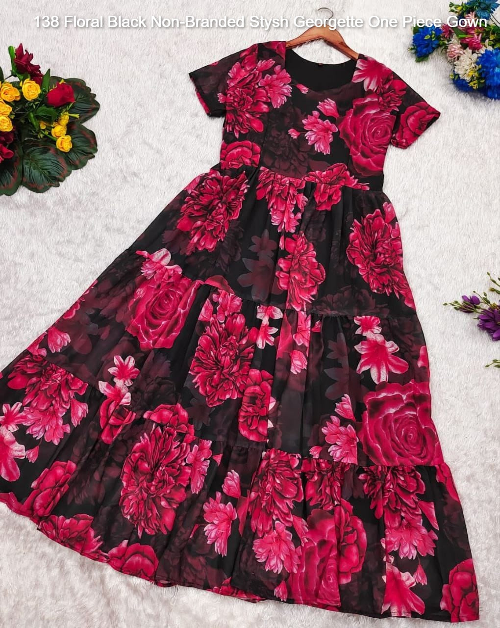 - 138 Floral Black Non-Branded Stysh Georgette One Piece Gown Dealer Ahmedabad Surat Wholesale Gujarat India Lowest Price Best Quality Buy Purchase Shipping Kurta Salwaar Kameez Also free Cash on delivery
