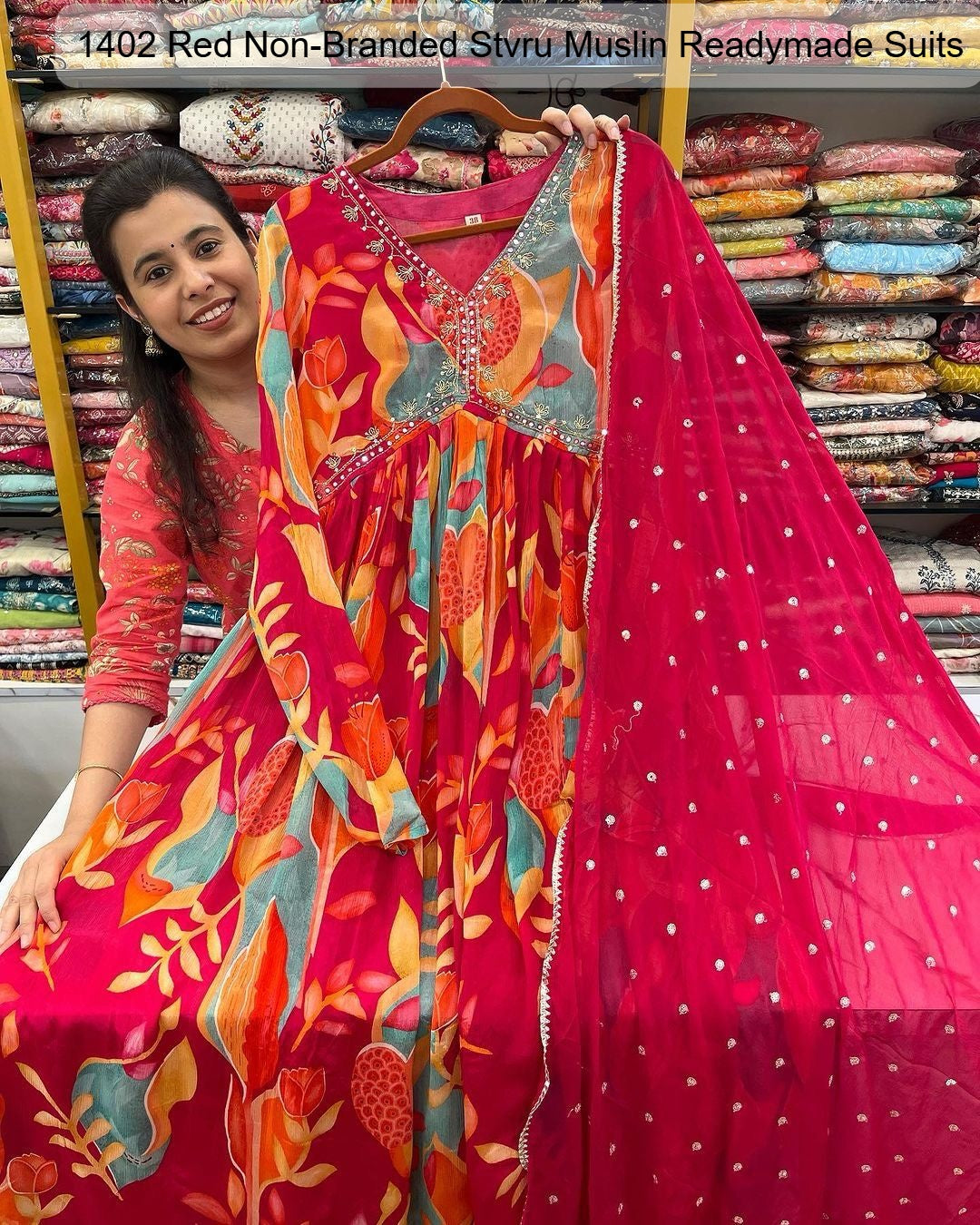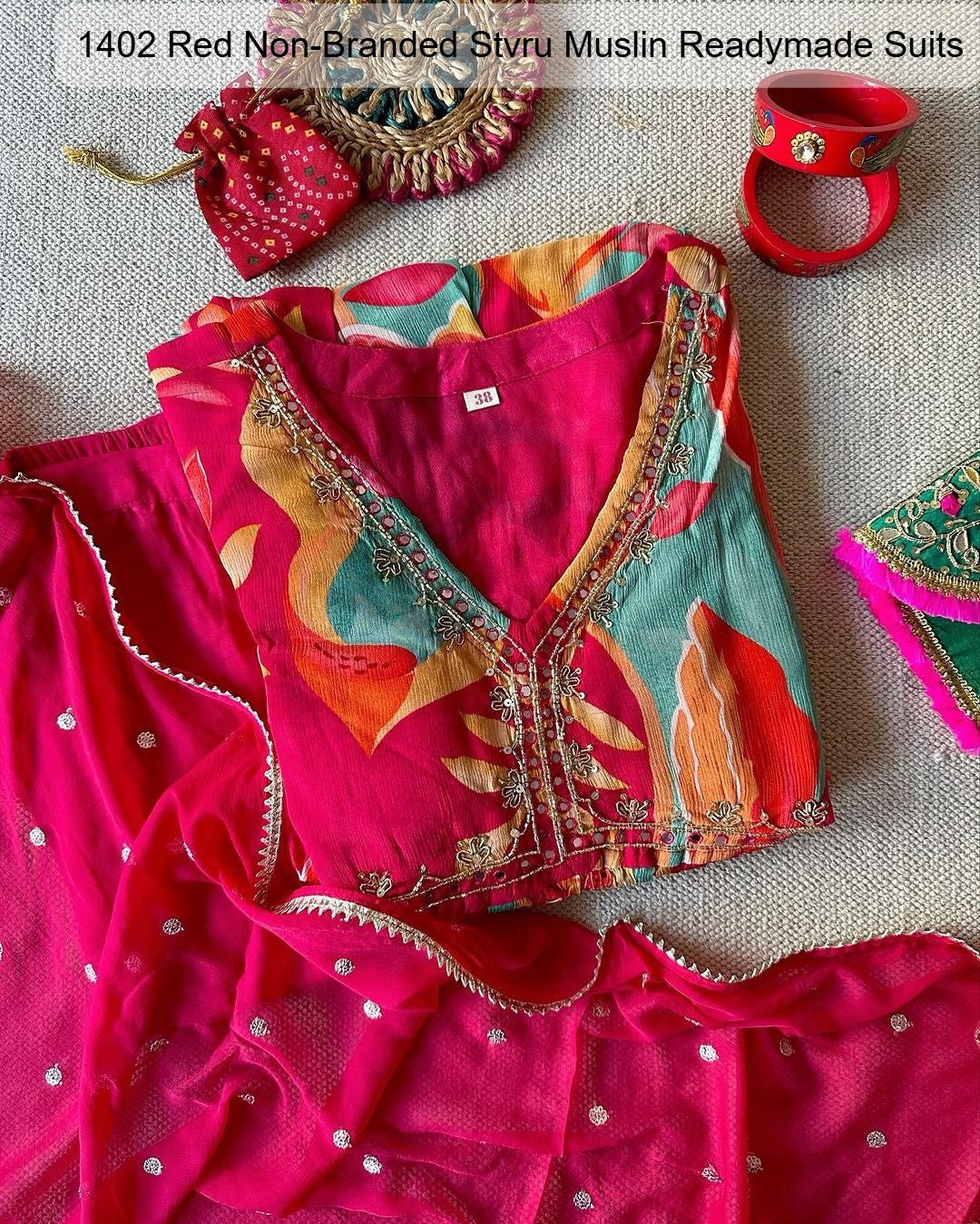 - 1402 Red Non-Branded Stvru Muslin Readymade Suits Dealer Ahmedabad Surat Wholesale Gujarat India Lowest Price Best Quality Buy Purchase Shipping Kurta Salwaar Kameez Also free Cash on delivery