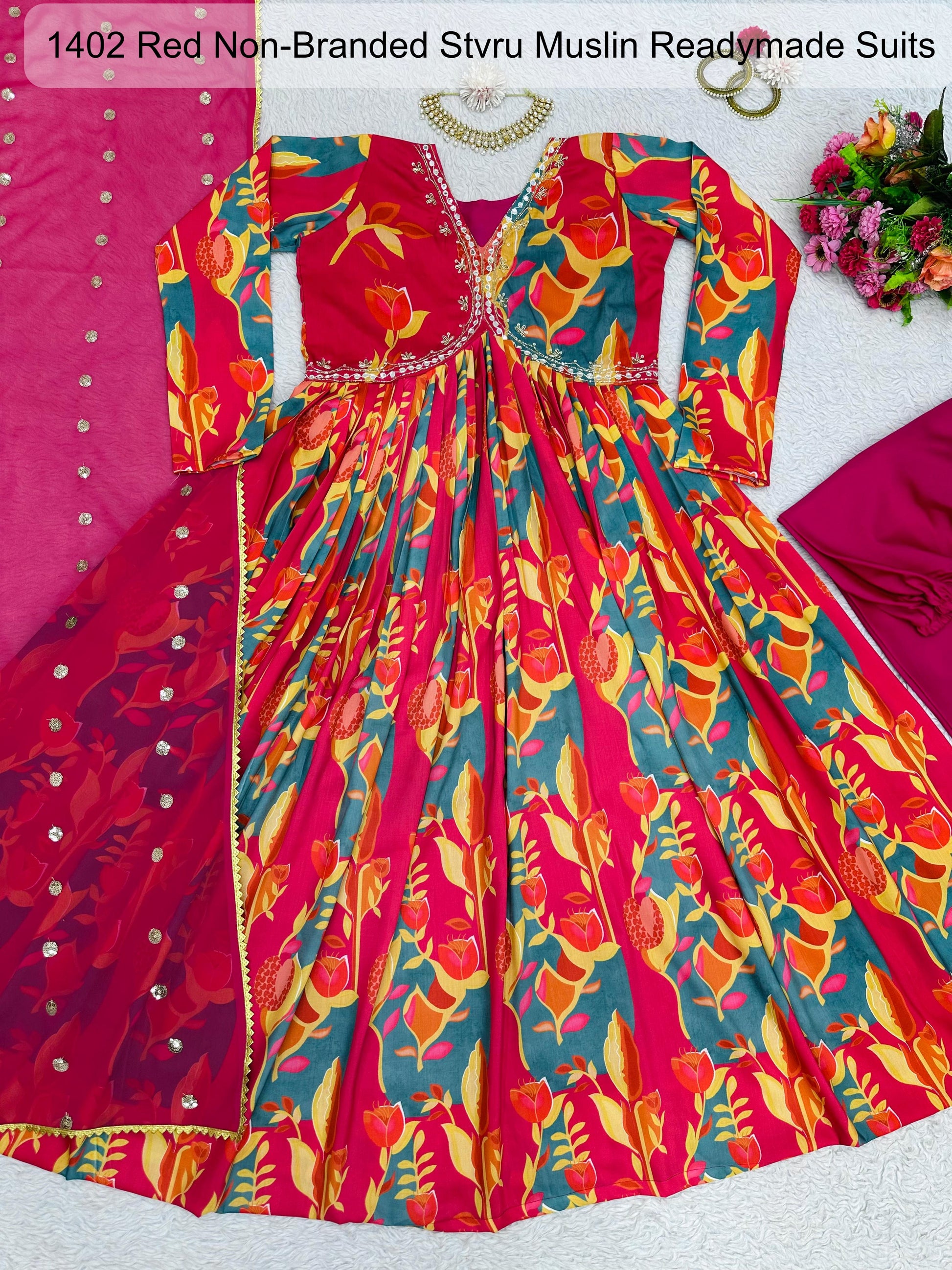 1402 Red Non-Branded Stvru Muslin Readymade Suits