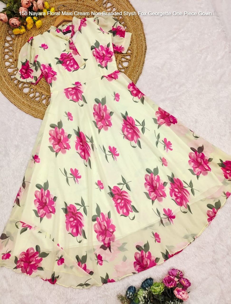 - 158 Nayara Floral Maxi Cream Non-Branded Stysh Fox Georgette One Piece Gown Dealer Ahmedabad Surat Wholesale Gujarat India Lowest Price Best Quality Buy Purchase Shipping Kurta Salwaar Kameez Also free Cash on delivery