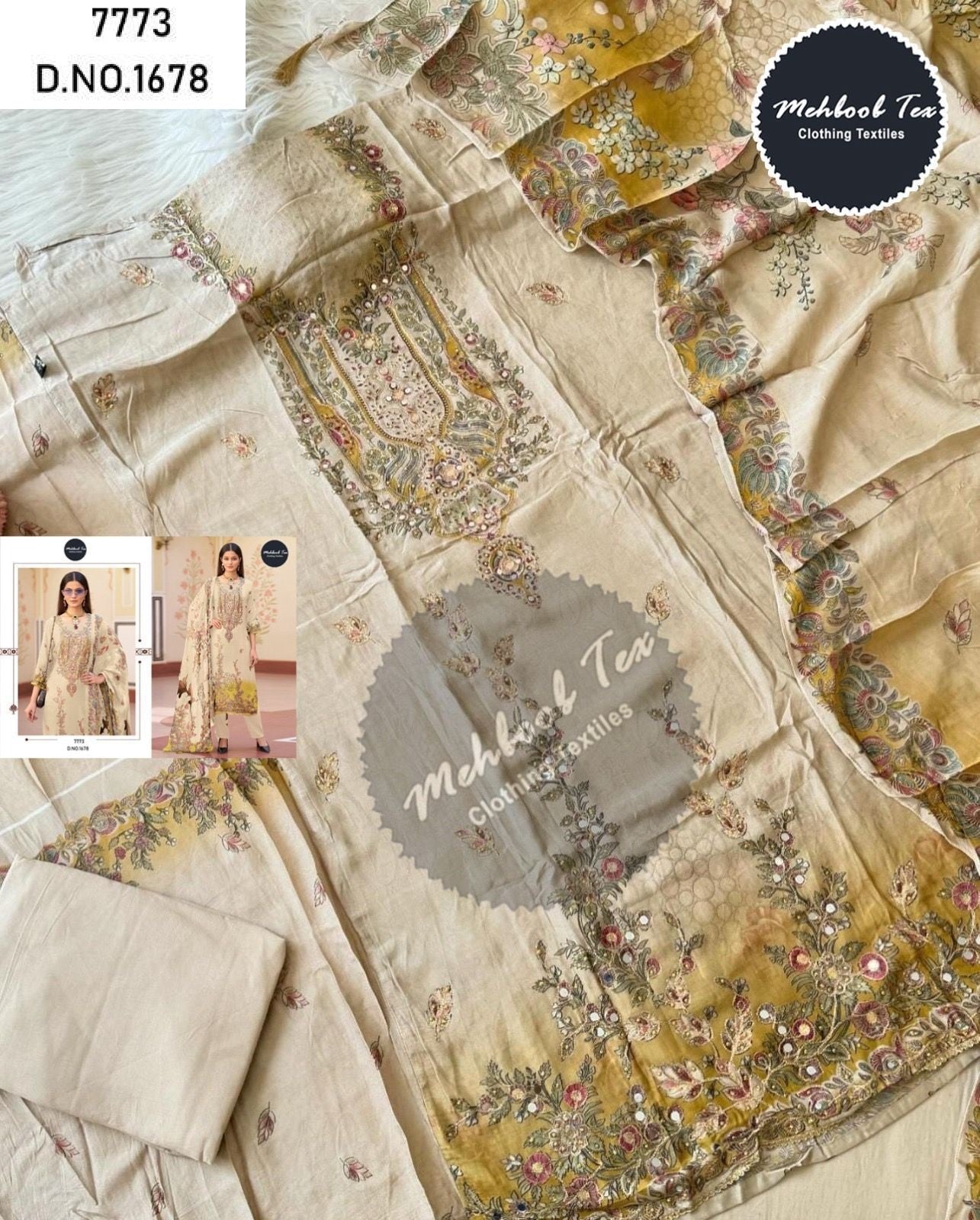 - 1678 Cream Mehboob Tex Printed Karachi Unstitched Suits Dealer Ahmedabad Surat Wholesale Gujarat India Lowest Price Best Quality Buy Purchase Shipping Kurta Salwaar Kameez Also free Cash on delivery