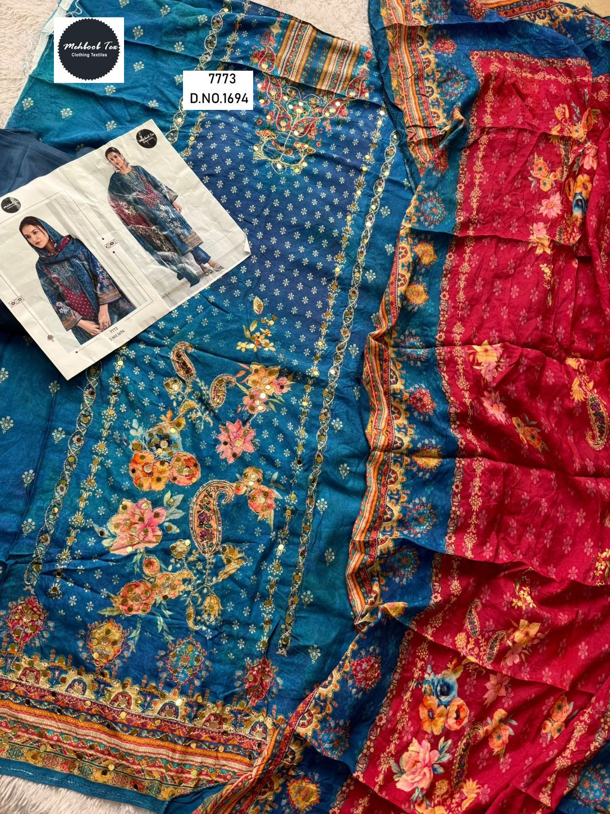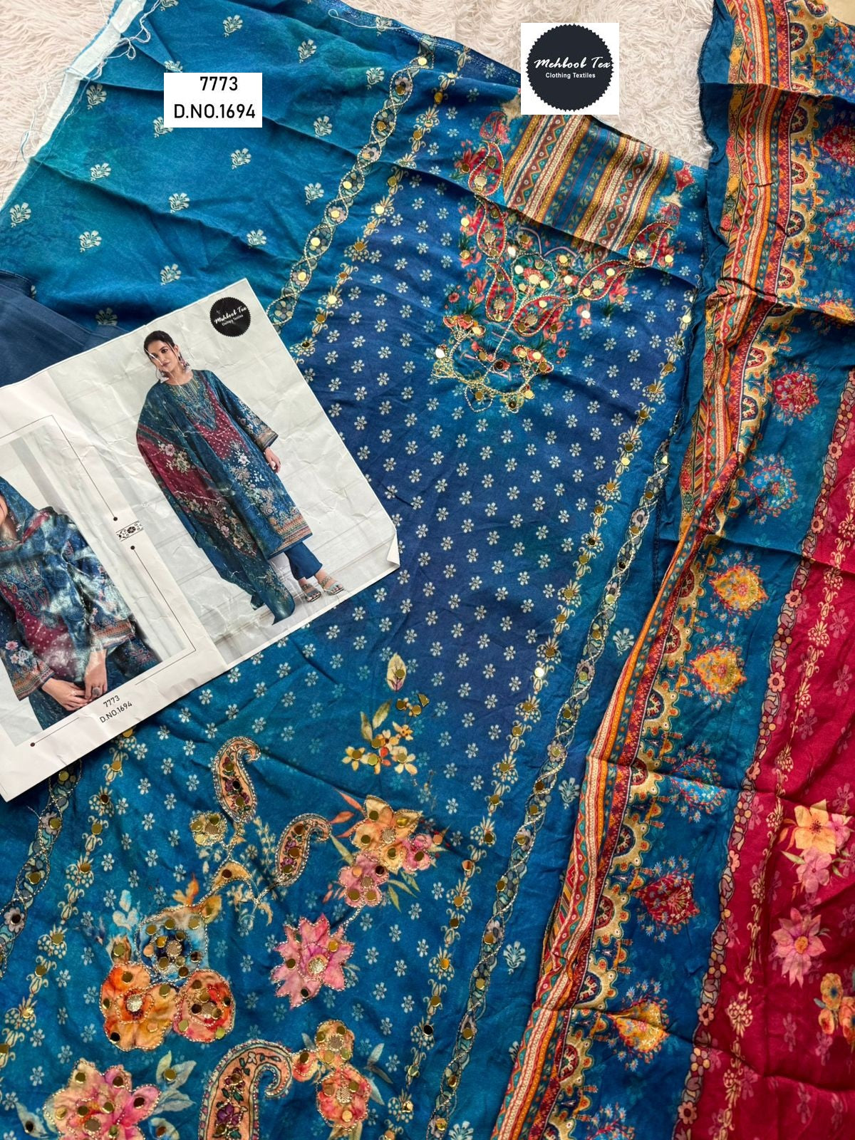 - 1694 Blue Mehboob Tex Printed Karachi Unstitched Suits Dealer Ahmedabad Surat Wholesale Gujarat India Lowest Price Best Quality Buy Purchase Shipping Kurta Salwaar Kameez Also free Cash on delivery