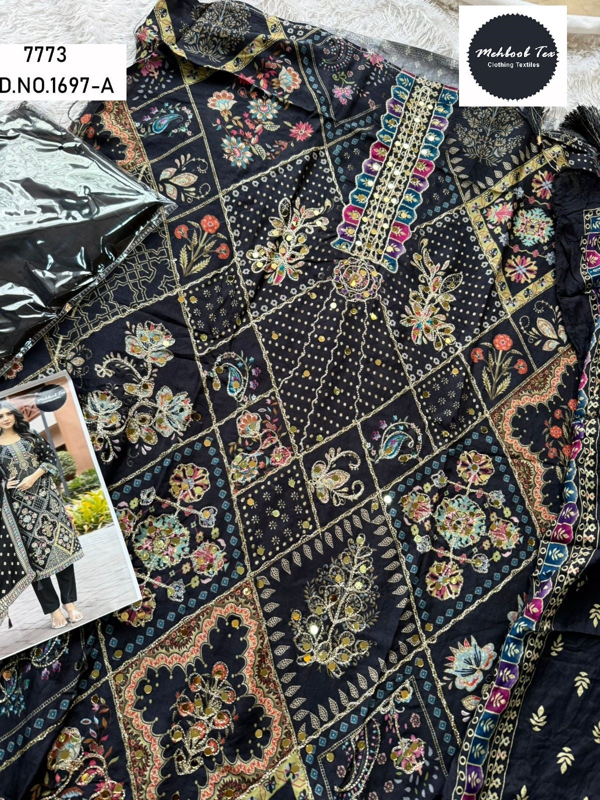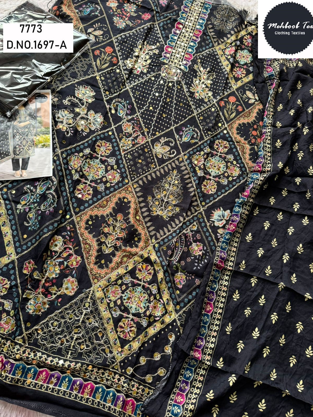 - 1697-A Mehboob Tex Printed Karachi Unstitched Suits Dealer Ahmedabad Surat Wholesale Gujarat India Lowest Price Best Quality Buy Purchase Shipping Kurta Salwaar Kameez Also free Cash on delivery