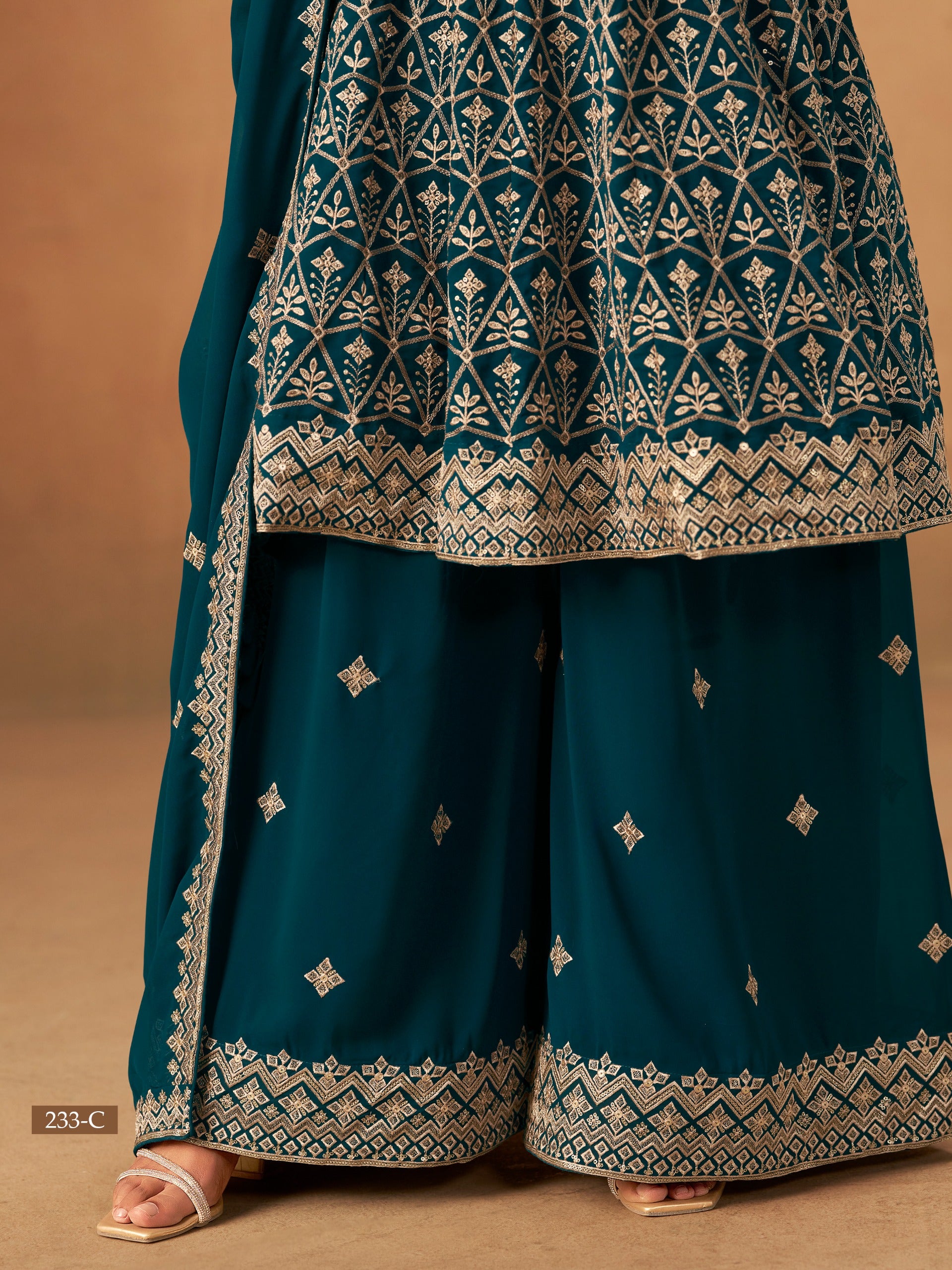 - Fabric Detail: Top : Faux Georgette Front And Back Side Work, Inner : Dull Santoon , Bottom (Plazzo ) : Faux Georgette , Dupatta : Faux Georgette ,
