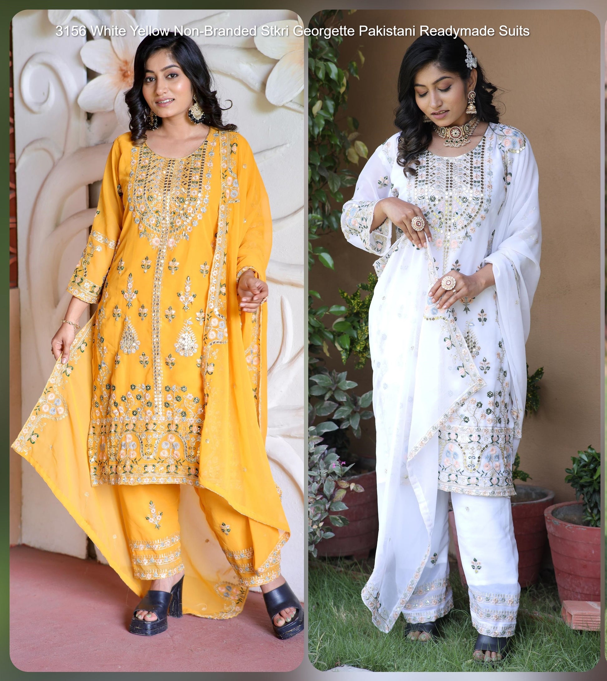 3156 White Yellow Non-Branded Stkri Georgette Pakistani Readymade Suits