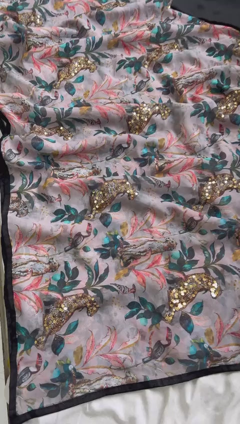 - Fabric Detail: Saree : Georgette Fancy Animal Print With Sequence Work, Cut : 5.50 Mtr , Blouse : Thai Silk, Cut : 0.90 Mtr Unstitched , ,