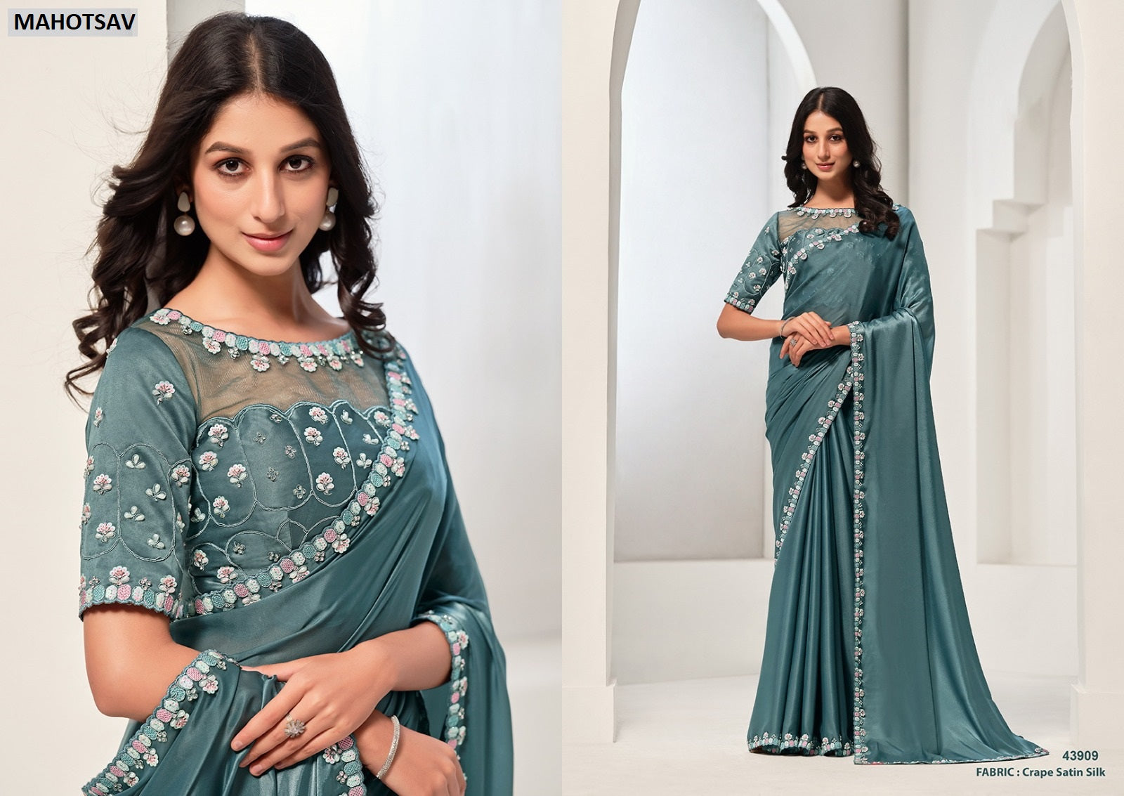 - Fabric Detail: Saree : Crepe Satain Silk,Sequence With Handwork, Blouse : Satin Silk, Length : 0.80 Mtrs Apx, Unstiched, ,