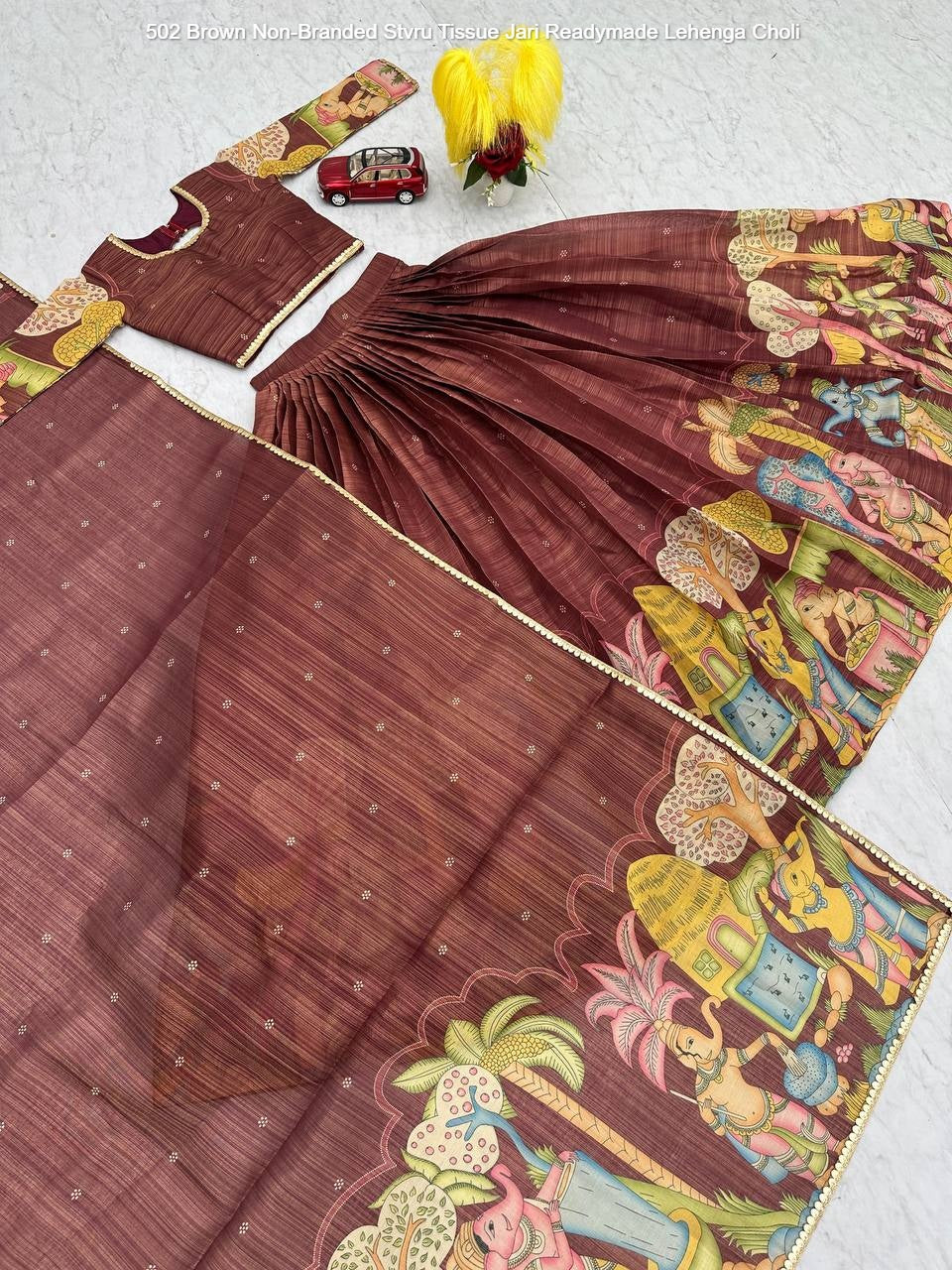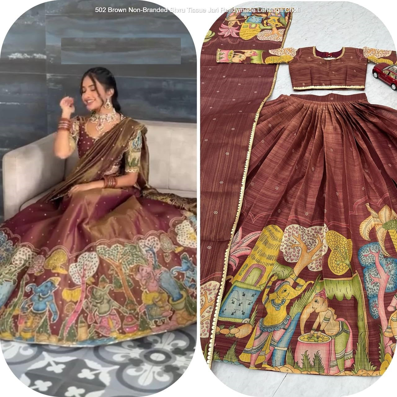 - 502 Brown Non-Branded Stvru Tissue Jari Readymade Lehenga Choli Dealer Ahmedabad Surat Wholesale Gujarat India Lowest Price Best Quality Buy Purchase Shipping Kurta Salwaar Kameez Also free Cash on delivery