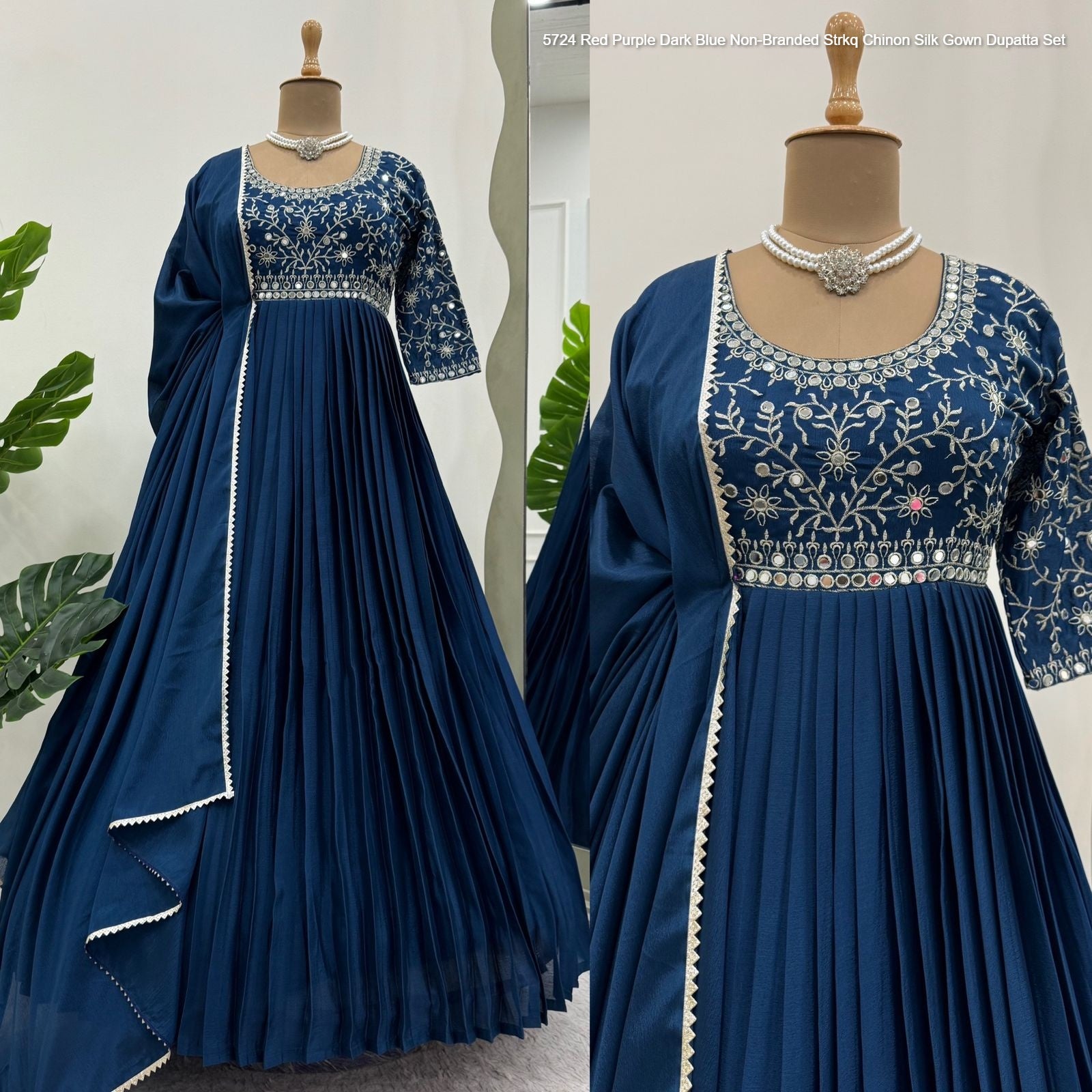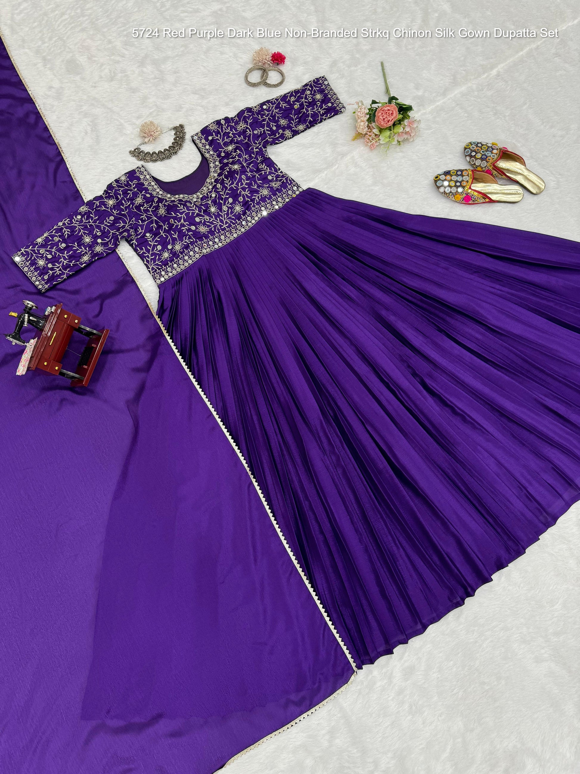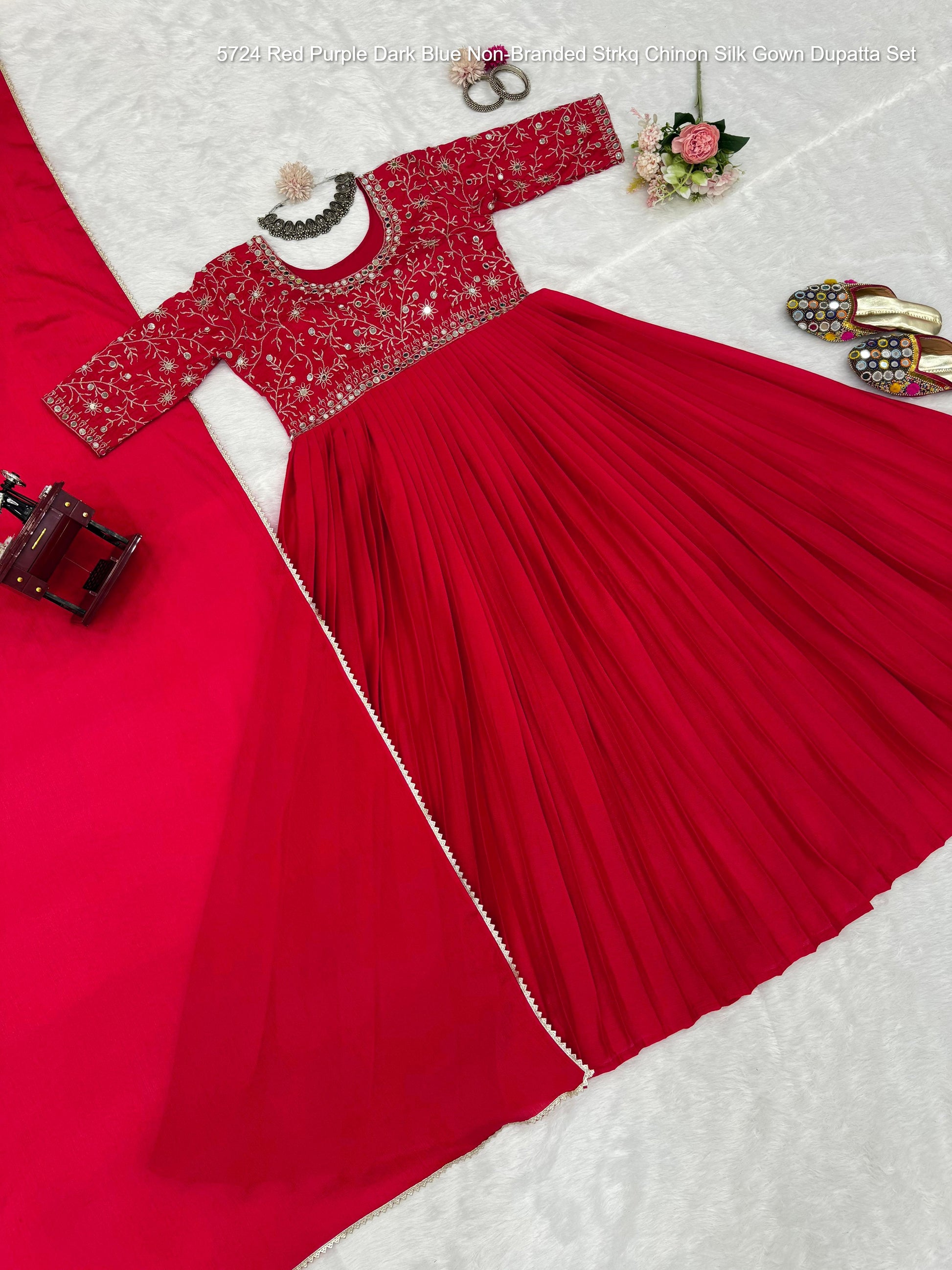 5724 Red Purple Dark Blue Non-Branded Strkq Chinon Silk Gown Dupatta Set