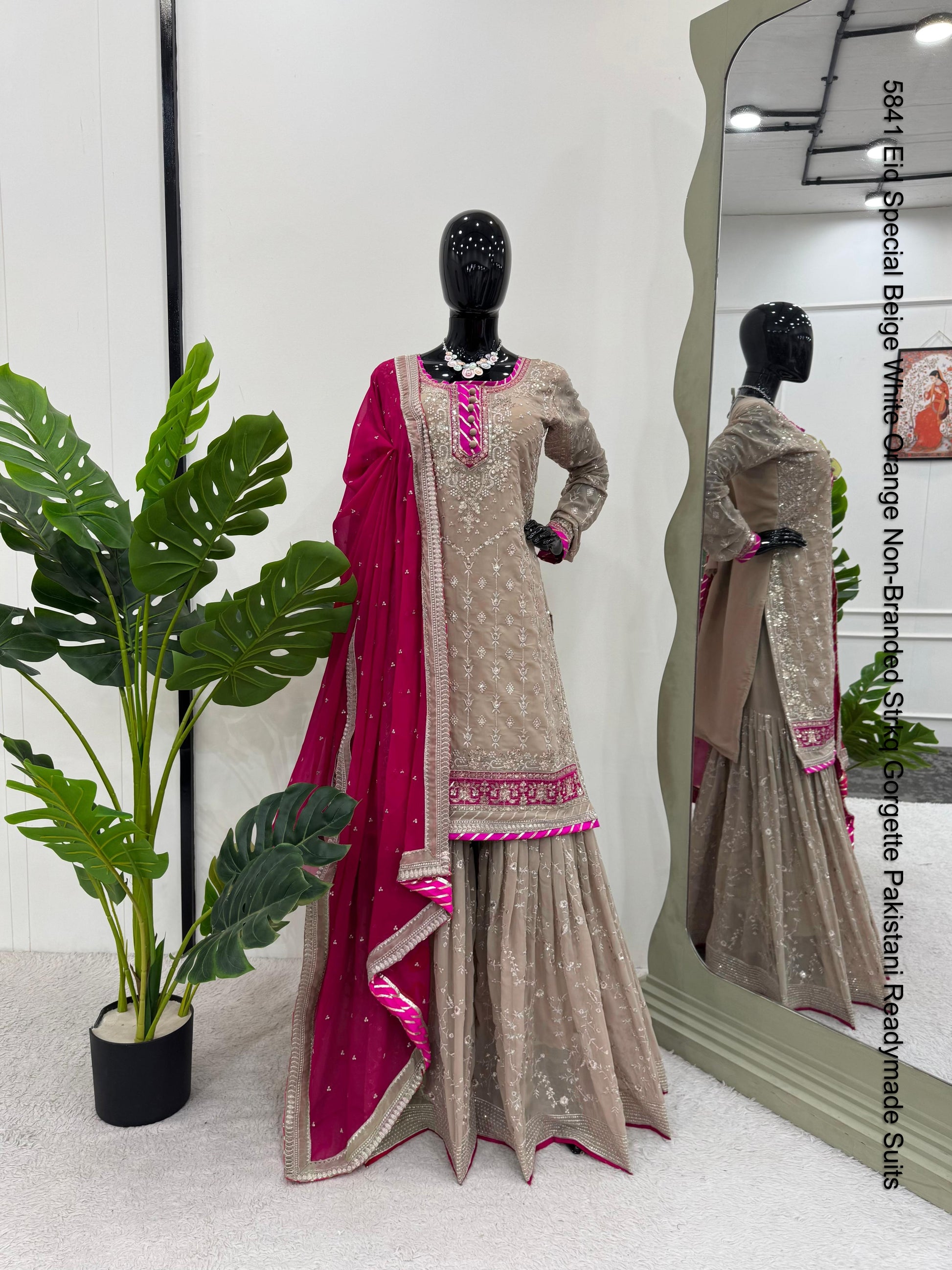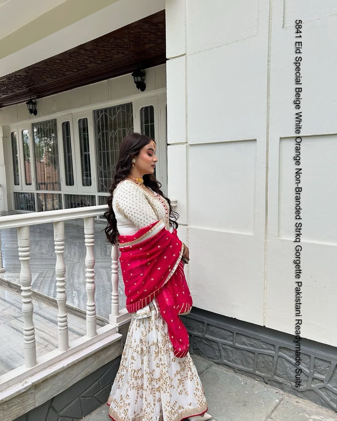 5841 Eid Special Beige White Orange Non-Branded Strkq Gorgette Pakistani Readymade Suits