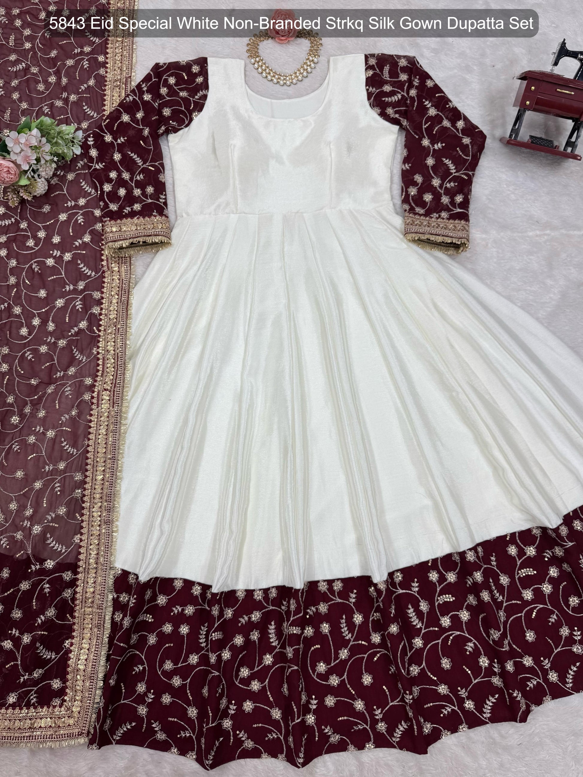5843 Eid Special White Non-Branded Strkq Silk Gown Dupatta Set