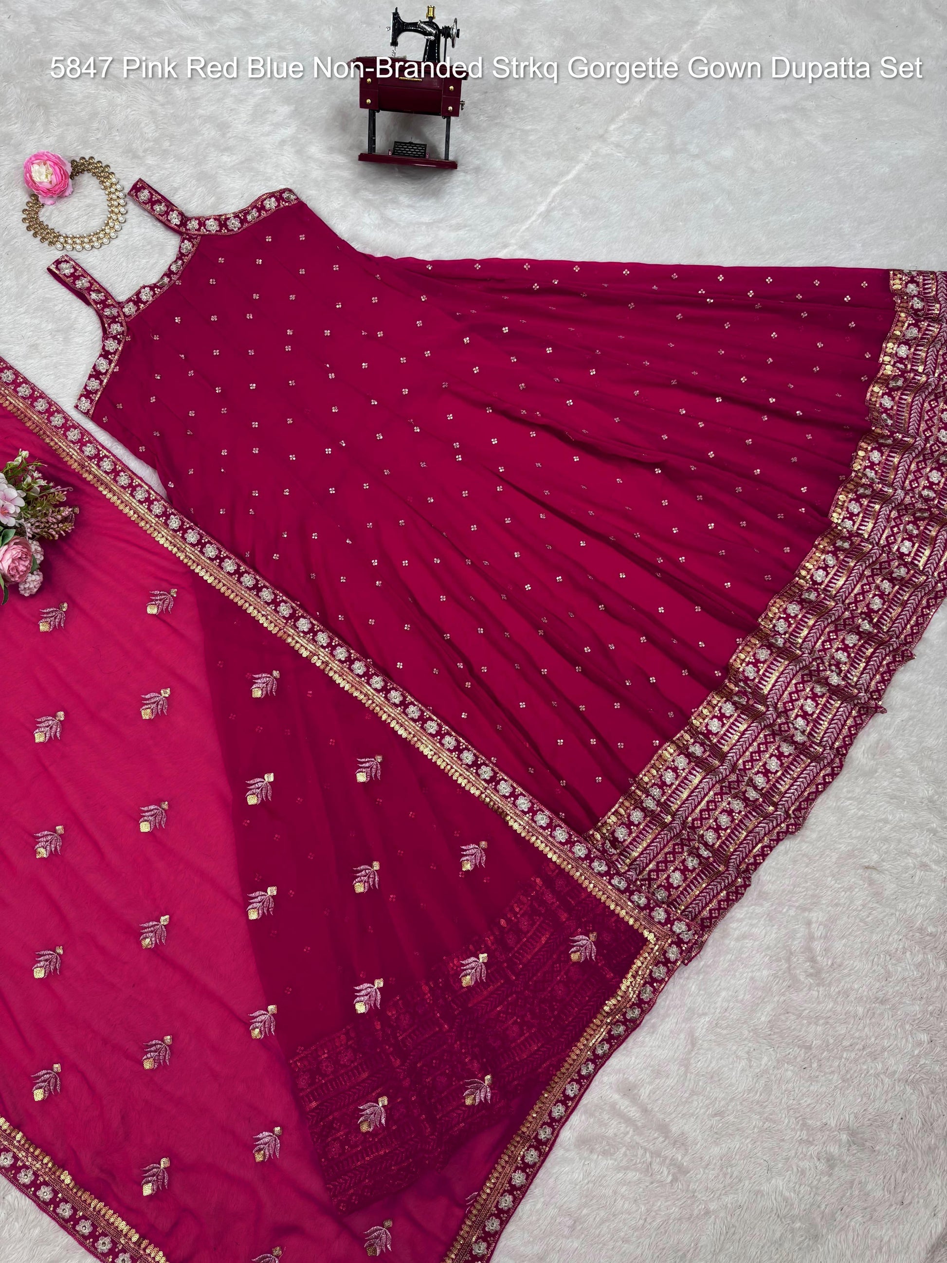 5847 Pink Red Blue Non-Branded Strkq Gorgette Gown Dupatta Set