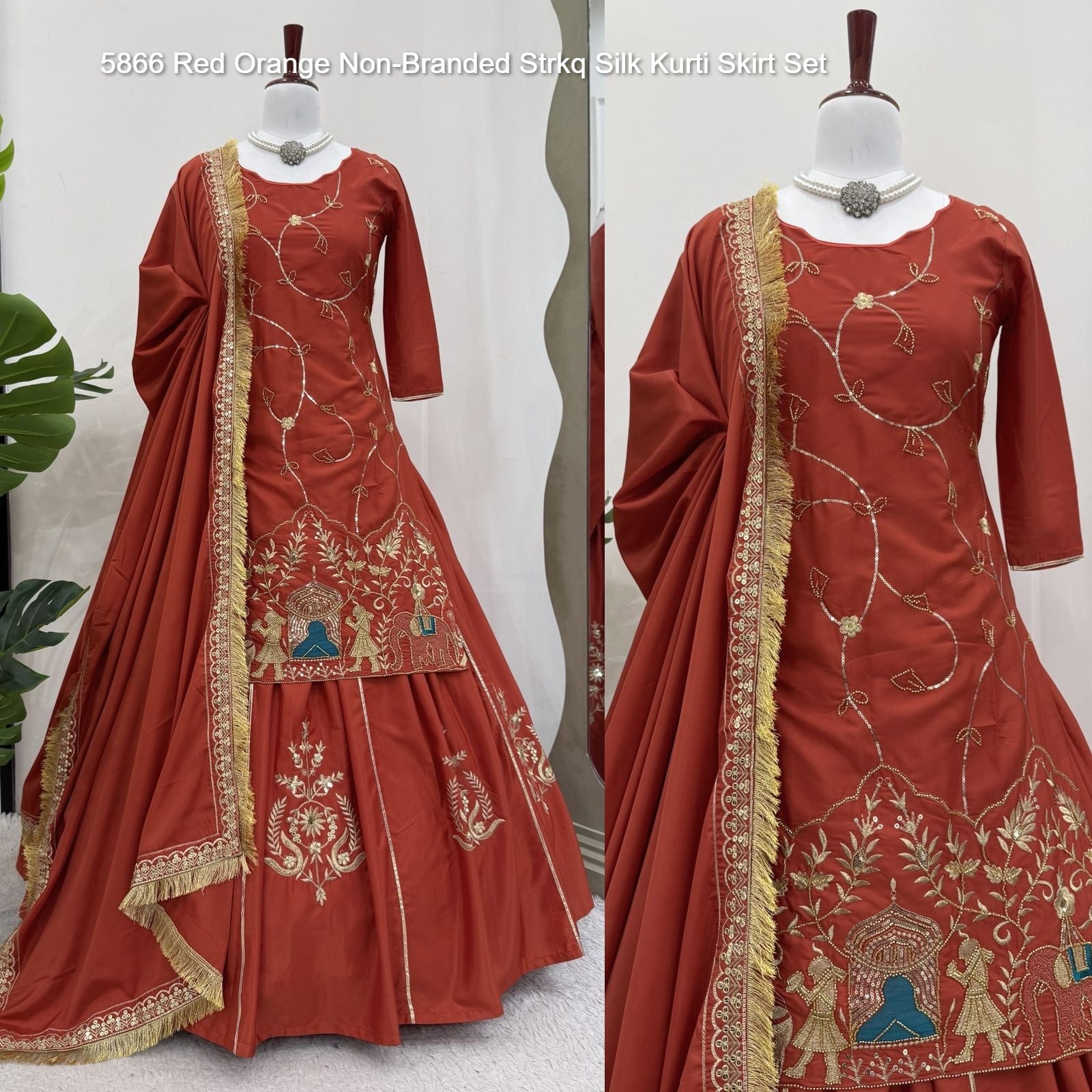 5866 Red Orange Non-Branded Strkq Silk Kurti Skirt Set