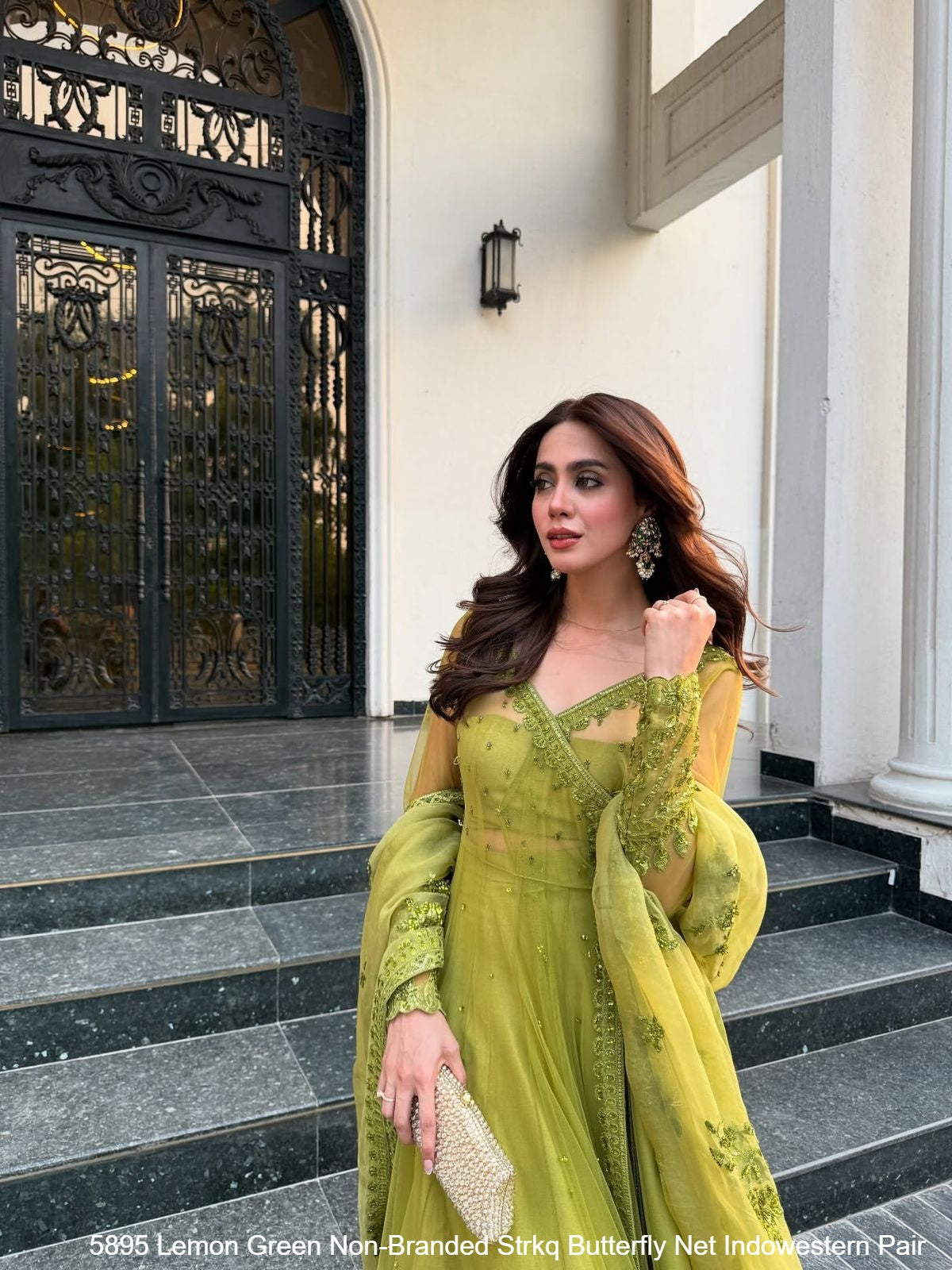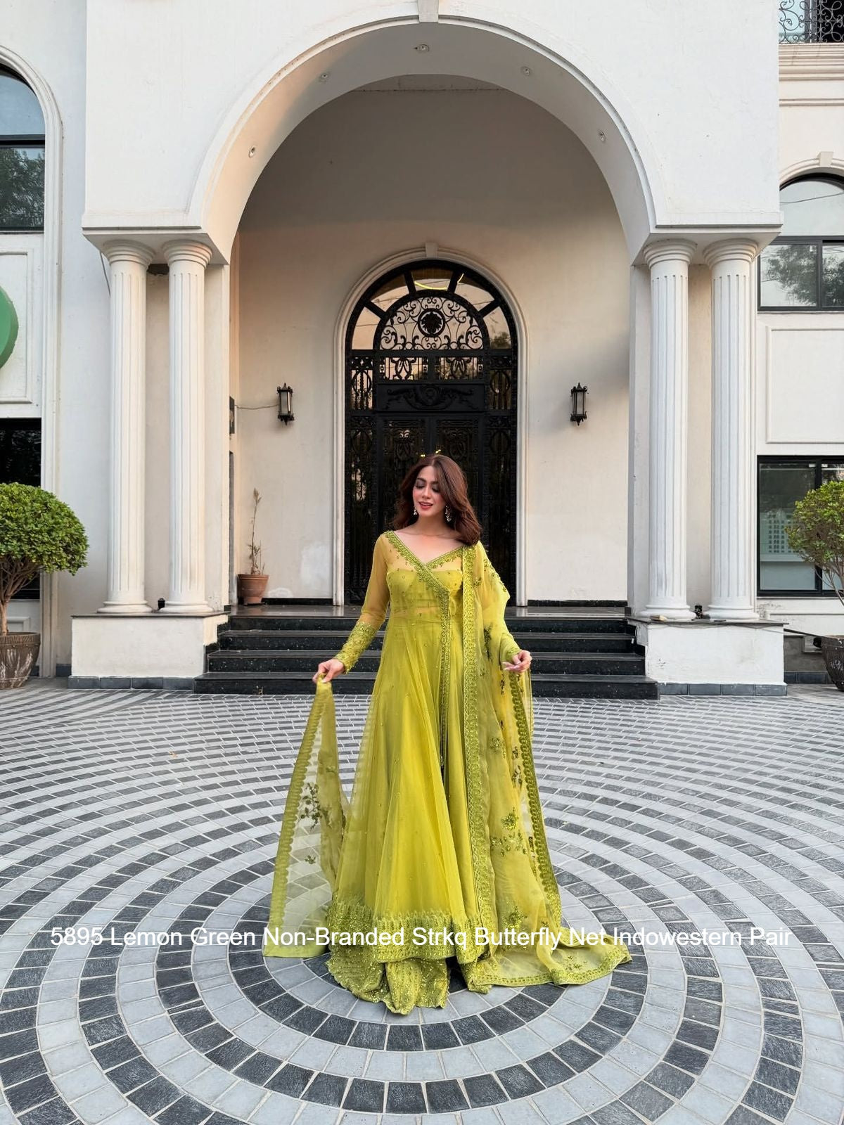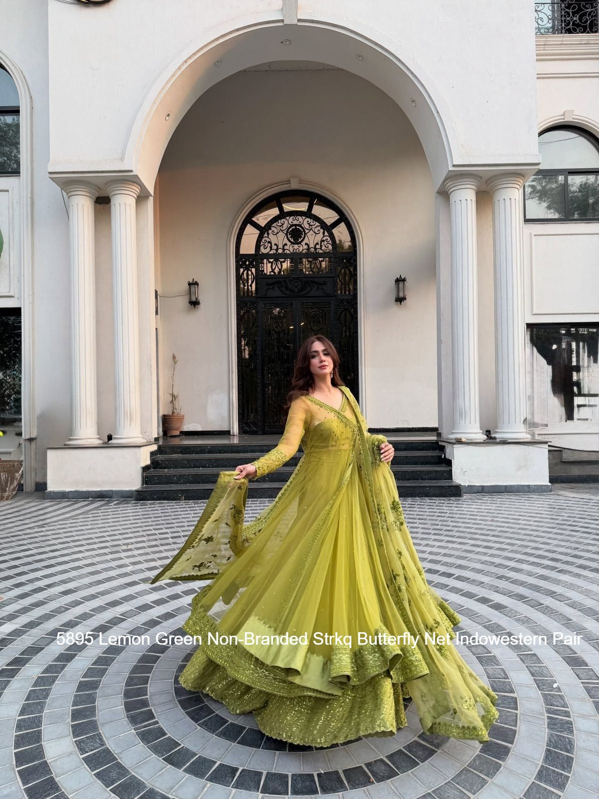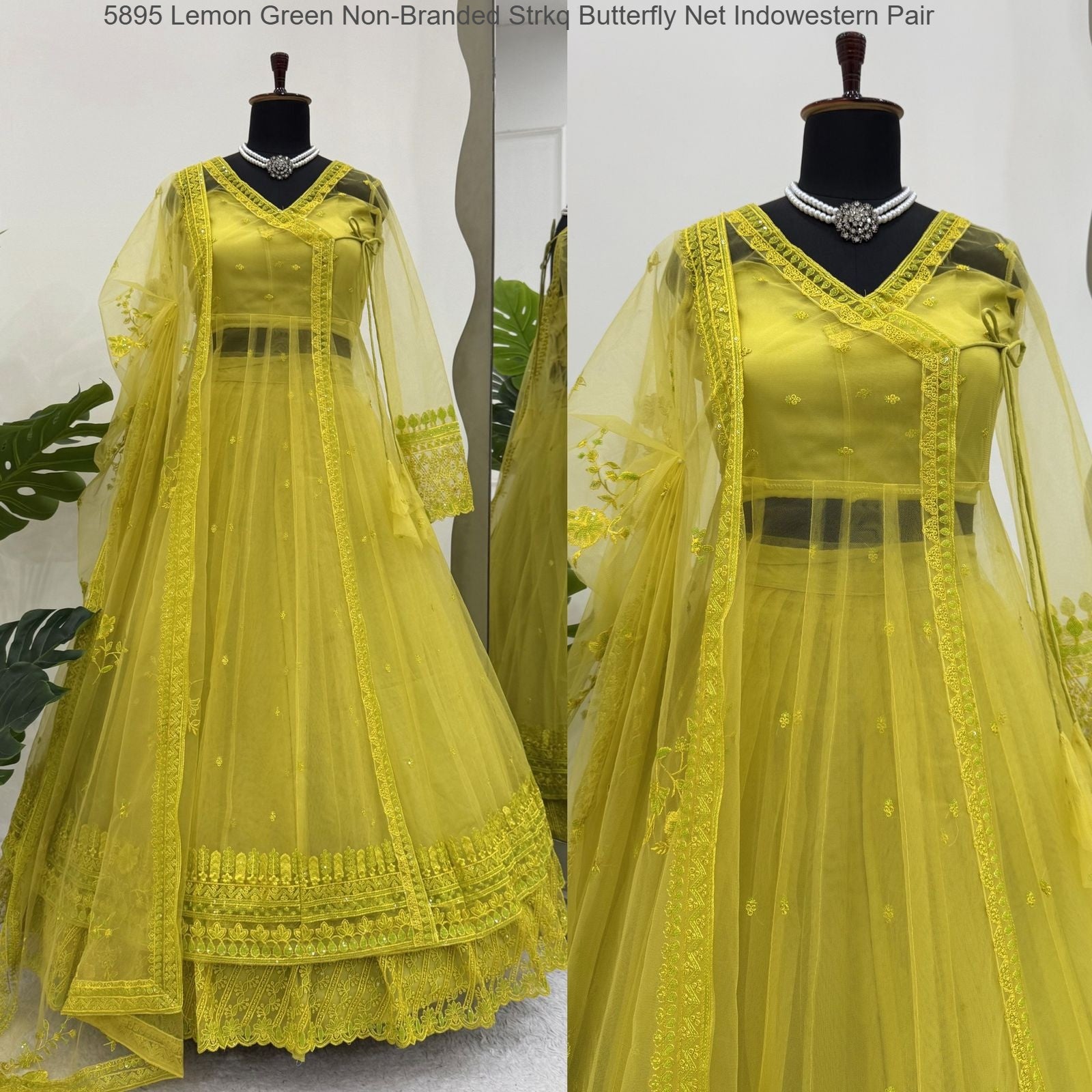 - 5895 Lemon Green Non-Branded Strkq Butterfly Net Indowestern Pair Dealer Ahmedabad Surat Wholesale Gujarat India Lowest Price Best Quality Buy Purchase Shipping Kurta Salwaar Kameez Also free Cash on delivery