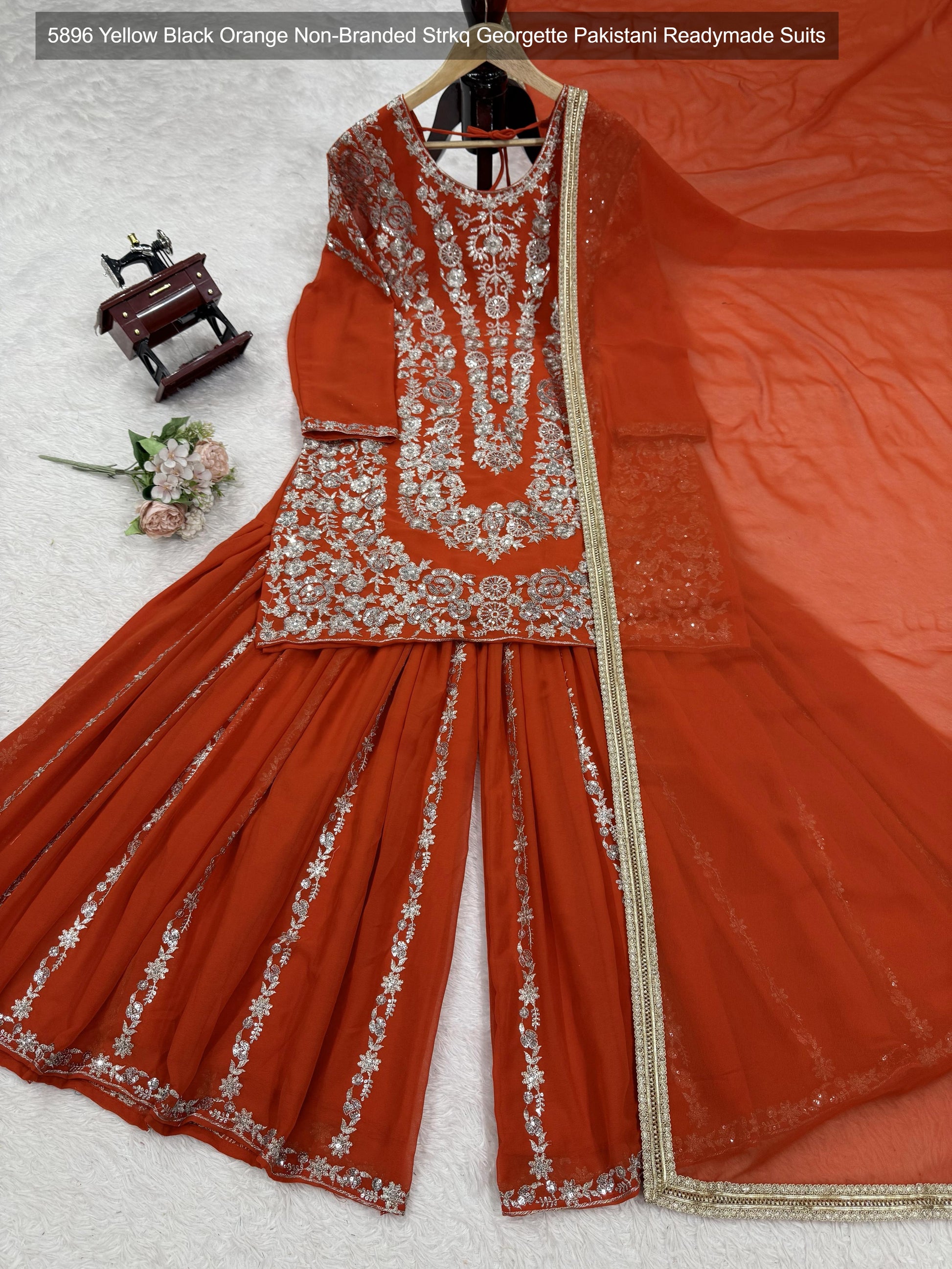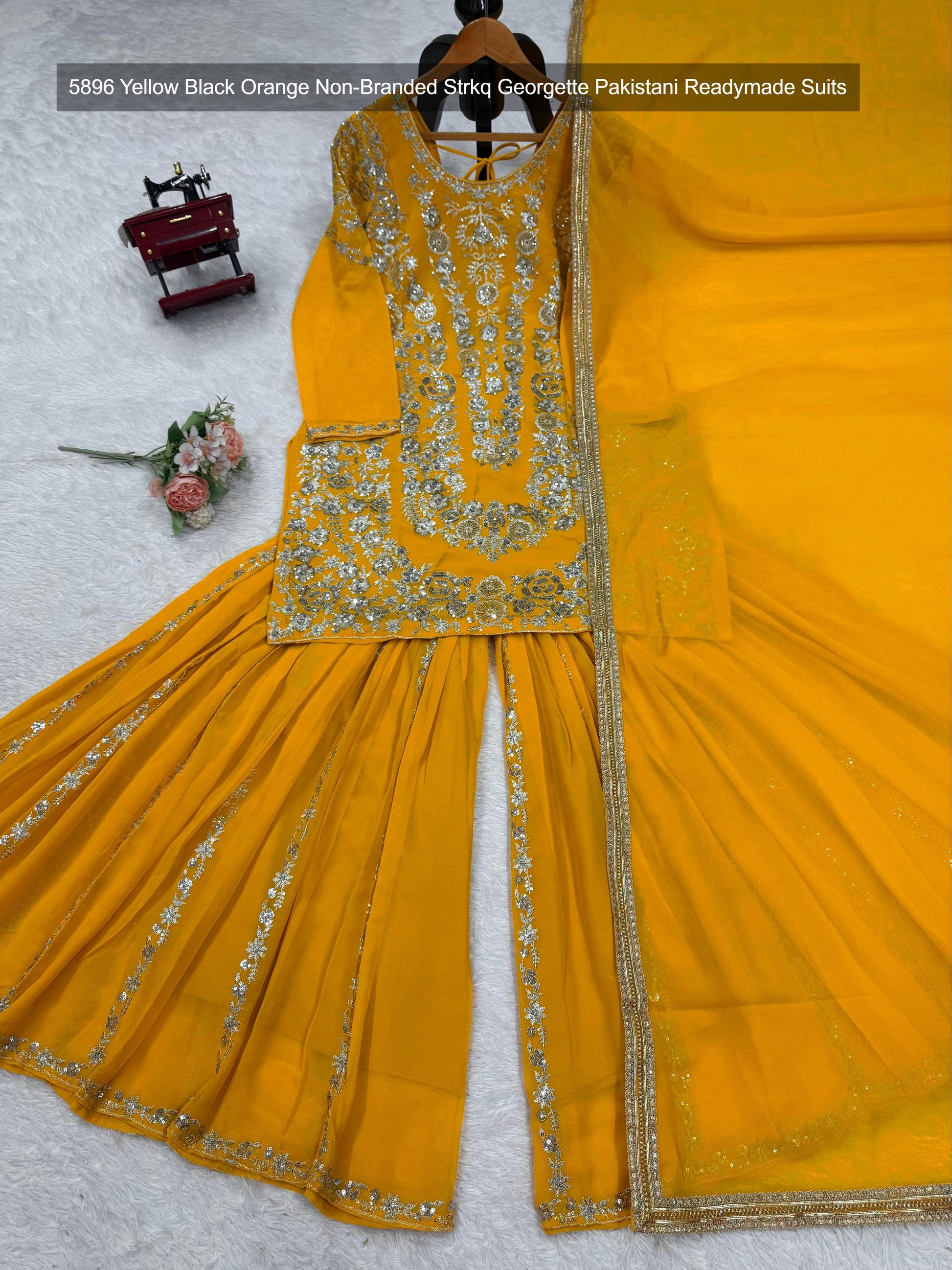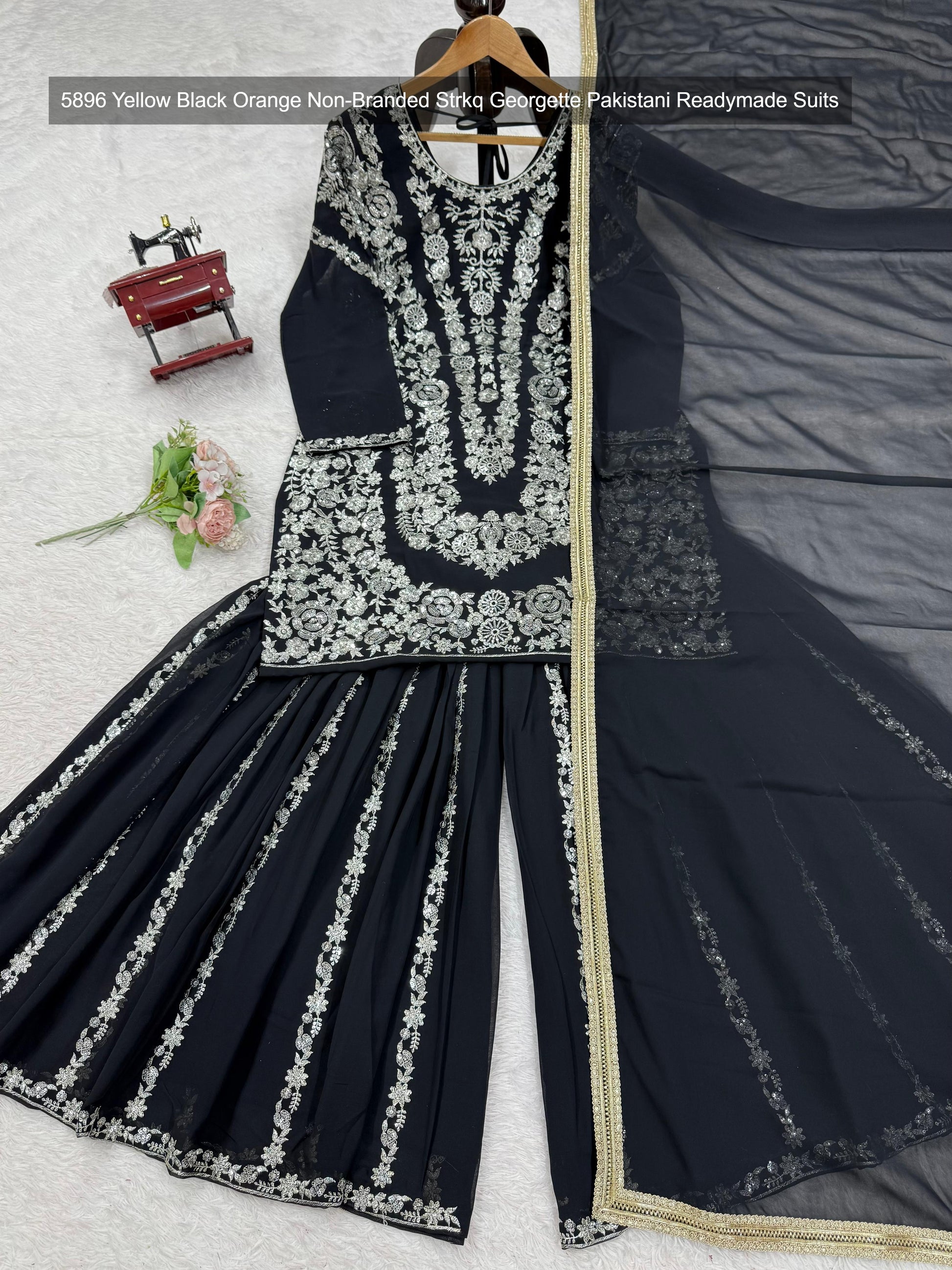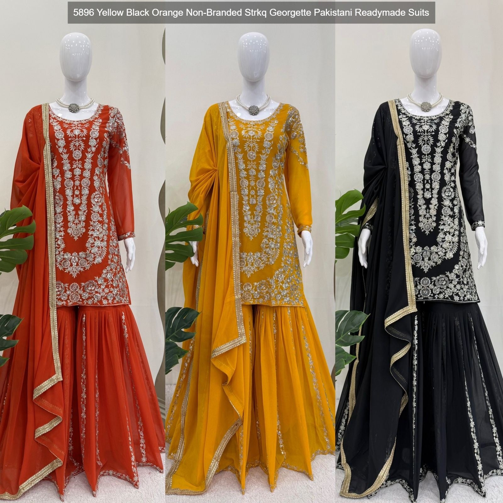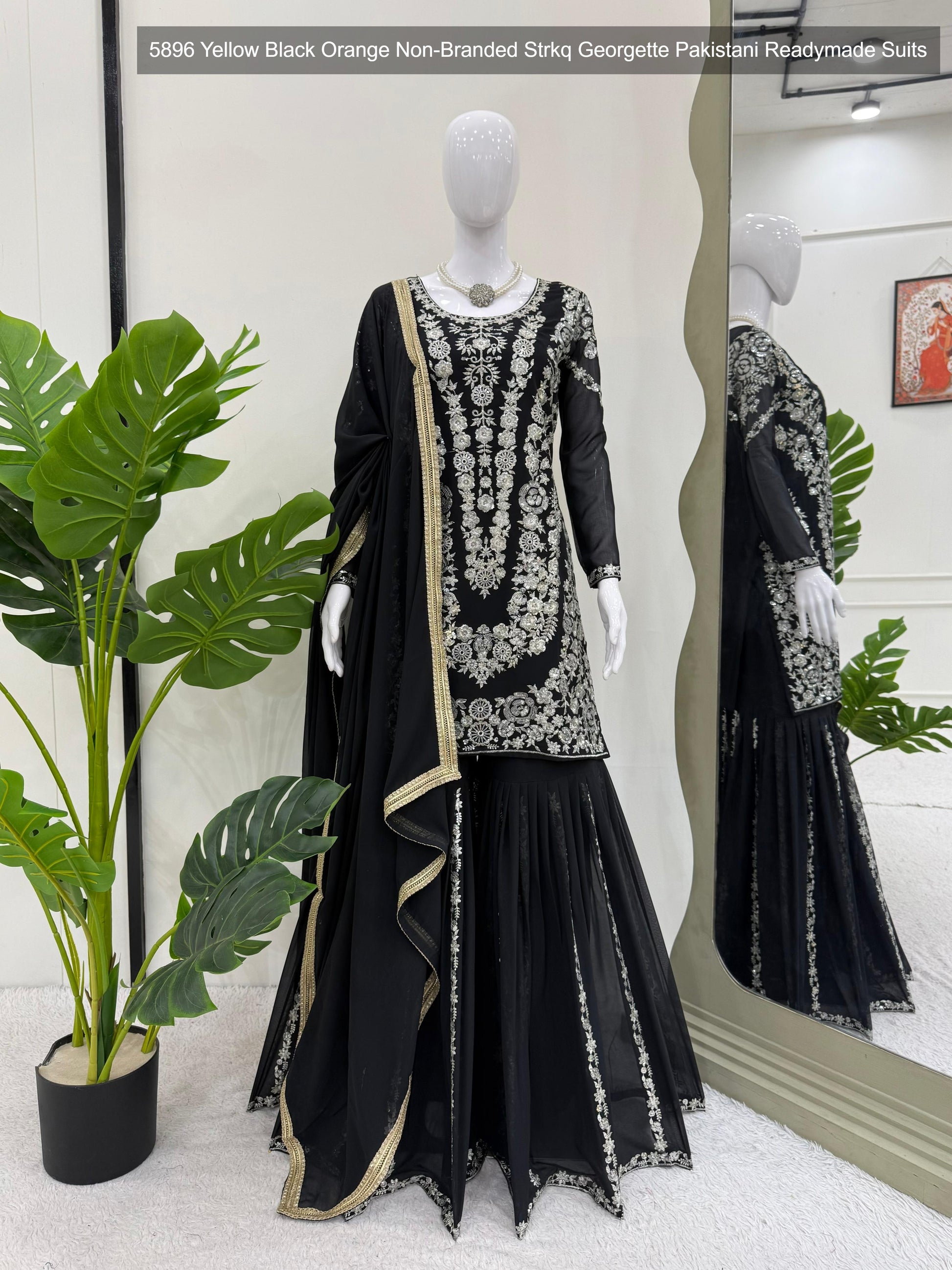 - 5896 Yellow Black Orange Non-Branded Strkq Georgette Pakistani Readymade Suits Dealer Ahmedabad Surat Wholesale Gujarat India Lowest Price Best Quality Buy Purchase Shipping Kurta Salwaar Kameez Also free Cash on delivery