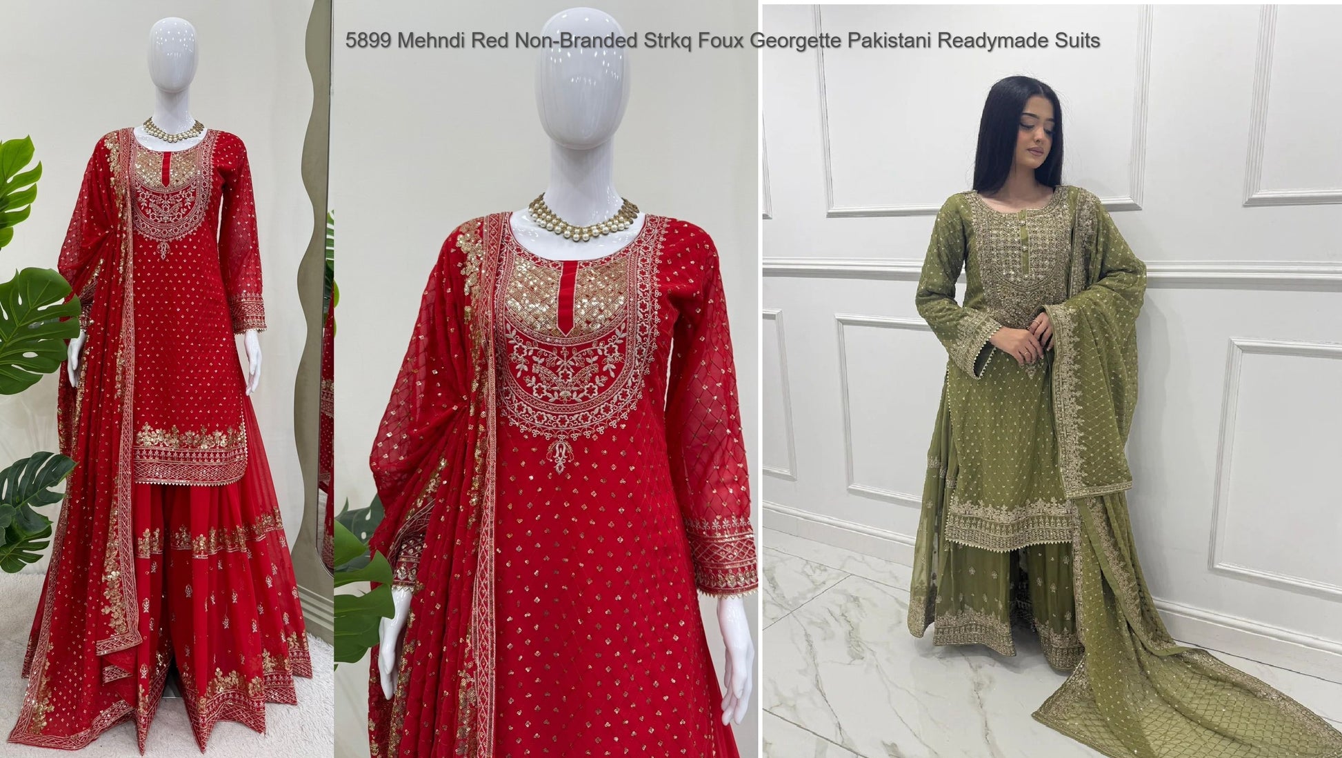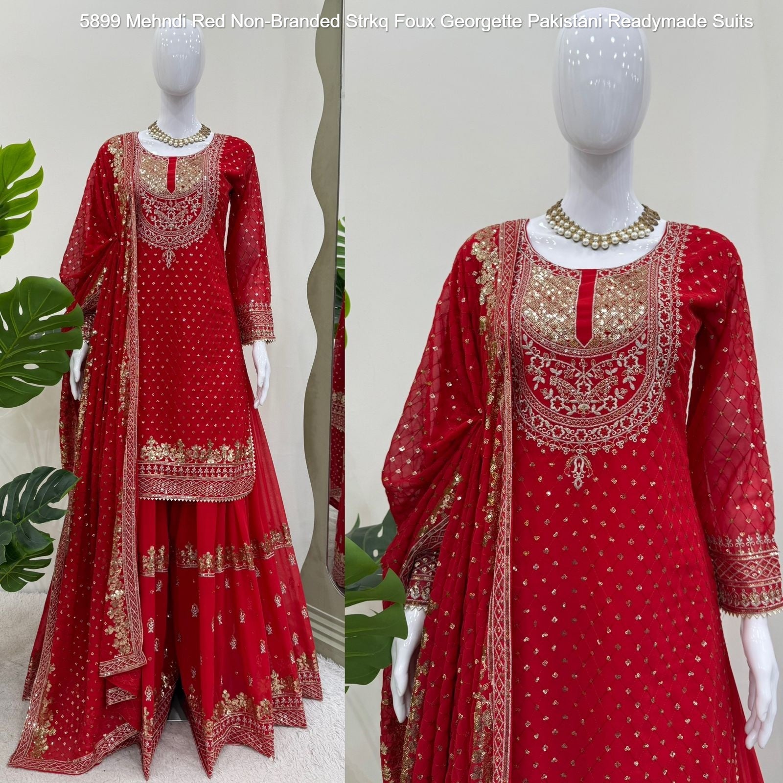 - 5899 Mehndi Red Non-Branded Strkq Foux Georgette Pakistani Readymade Suits Dealer Ahmedabad Surat Wholesale Gujarat India Lowest Price Best Quality Buy Purchase Shipping Kurta Salwaar Kameez Also free Cash on delivery