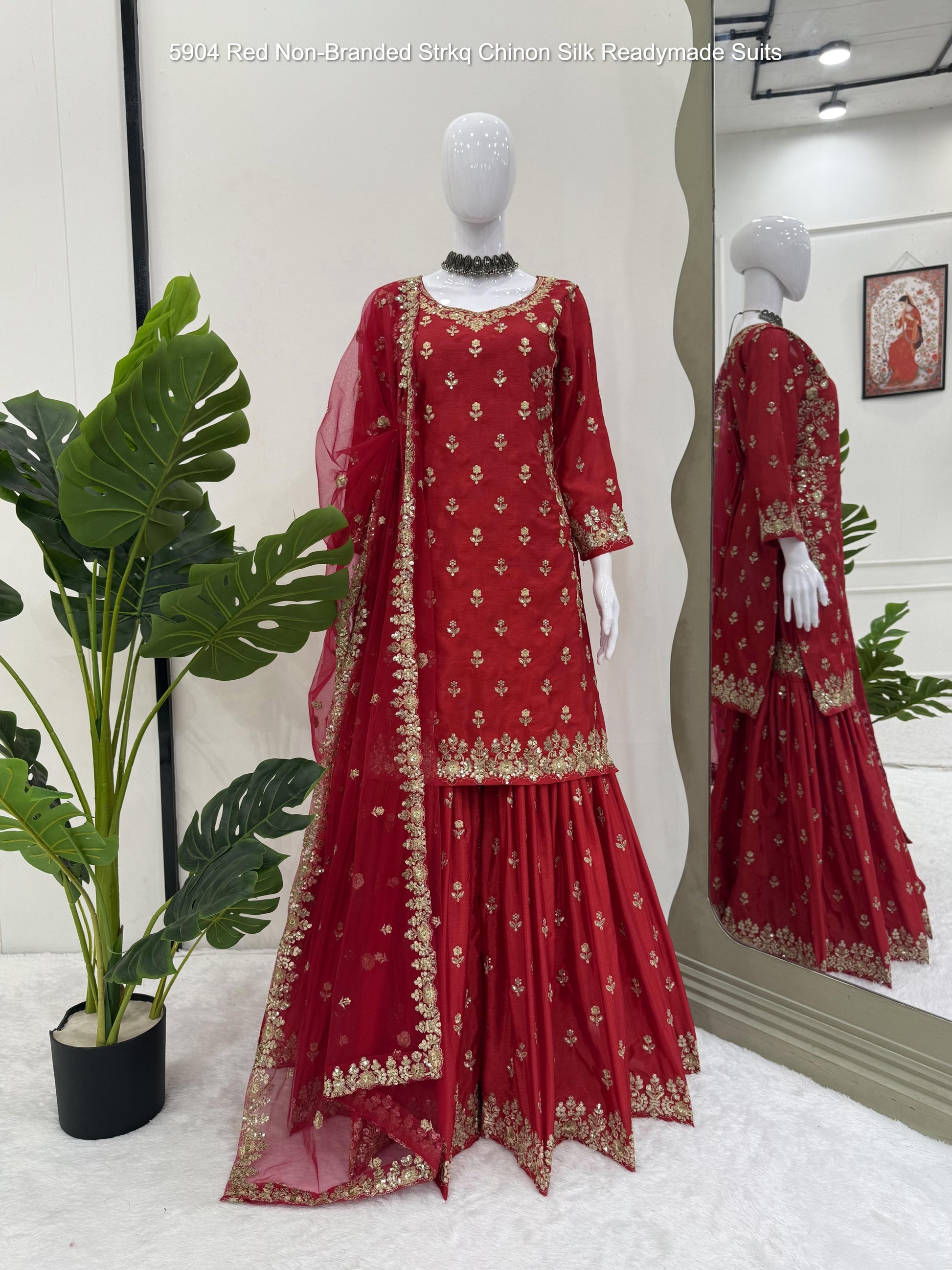 - 5904 Red Non-Branded Strkq Chinon Silk Readymade Suits Dealer Ahmedabad Surat Wholesale Gujarat India Lowest Price Best Quality Buy Purchase Shipping Kurta Salwaar Kameez Also free Cash on delivery