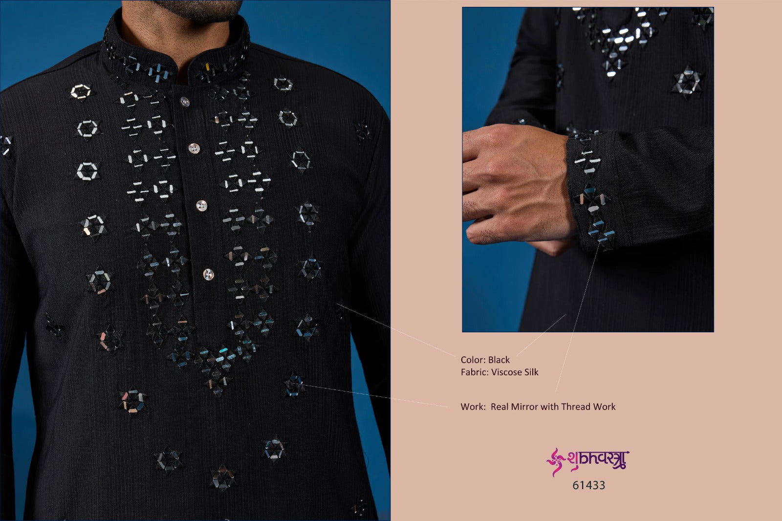 - 61433 Black Shubhvastra Viscose Silk Mens Kurta Pyjama Dealer Ahmedabad Surat Wholesale Gujarat India Lowest Price Best Quality Buy Purchase Shipping Kurta Salwaar Kameez Also free Cash on delivery