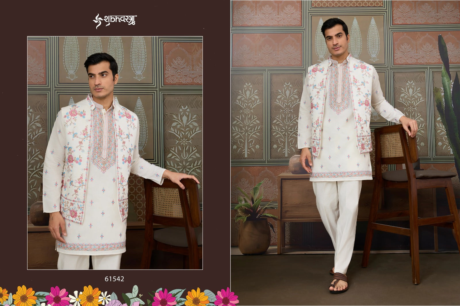 61542 Golden Viraasat Unstitch Shubhvastra With Koti Mens Kurta Pyjama