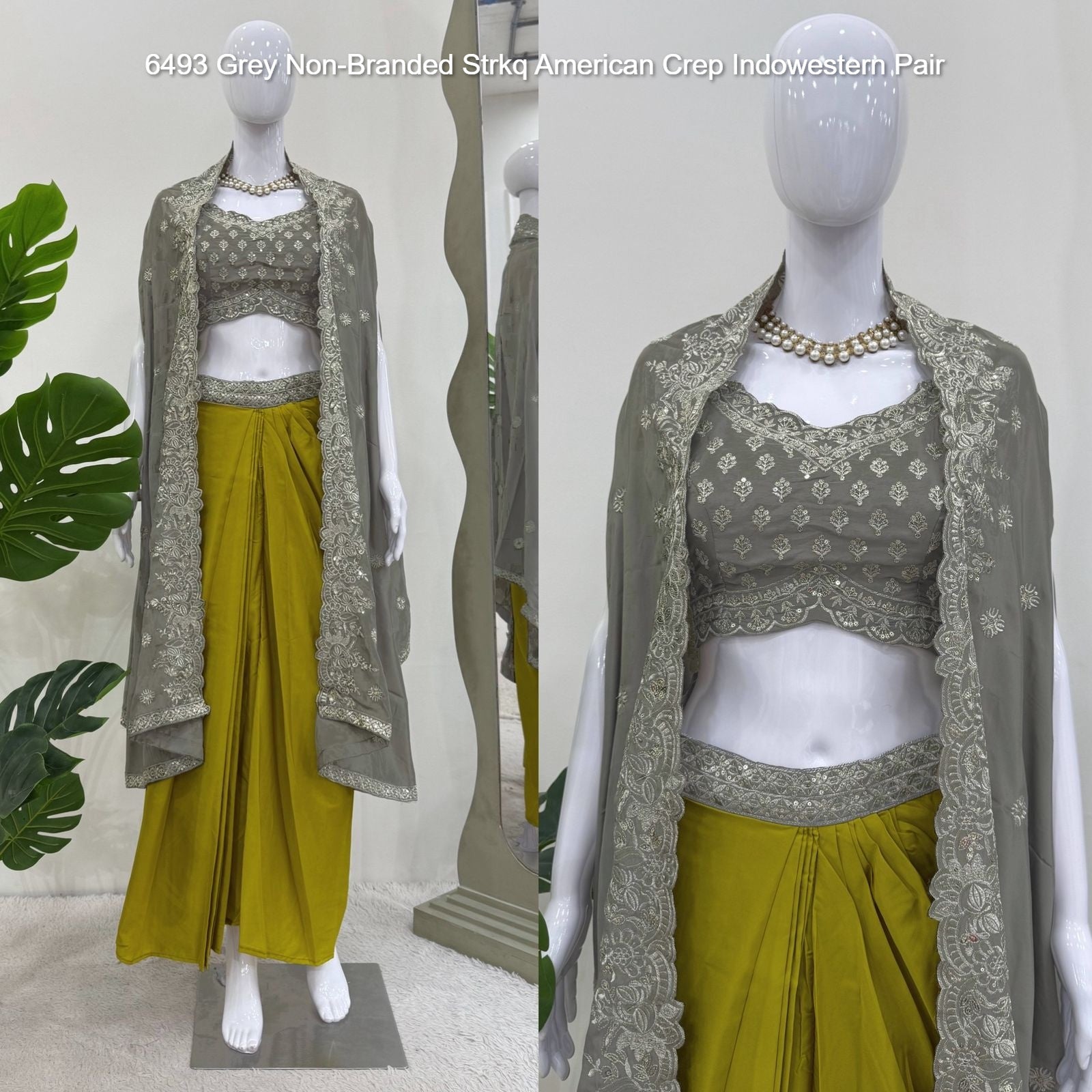- 6493 Grey Non-Branded Strkq American Crep Indowestern Pair Dealer Ahmedabad Surat Wholesale Gujarat India Lowest Price Best Quality Buy Purchase Shipping Kurta Salwaar Kameez Also free Cash on delivery