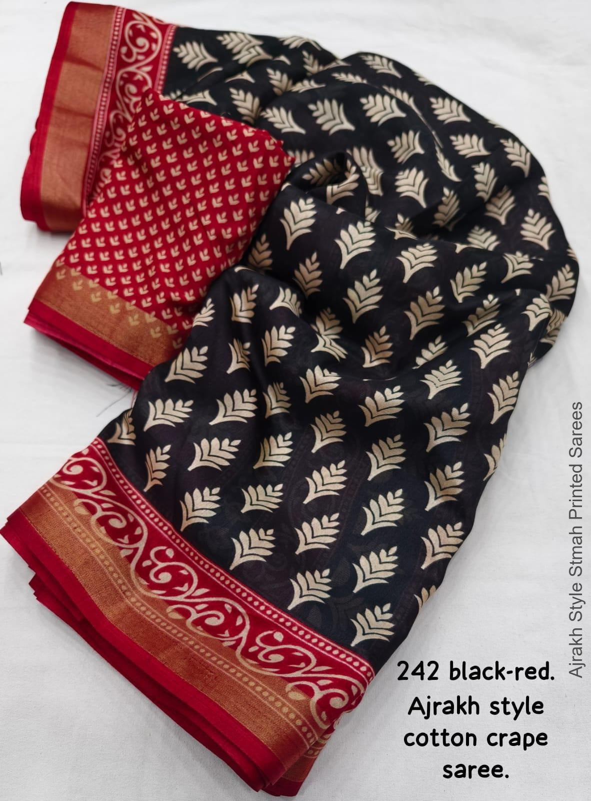 - Fabric Detail: Saree : Soft Cotton Crepe With Zari Pattu Woven Border Ajrakh Style Prints, Cut : 5.5 Mtr , Blouse : Running Cotton Crepe, Cut : 0.80 Mtr Unstitched , ,