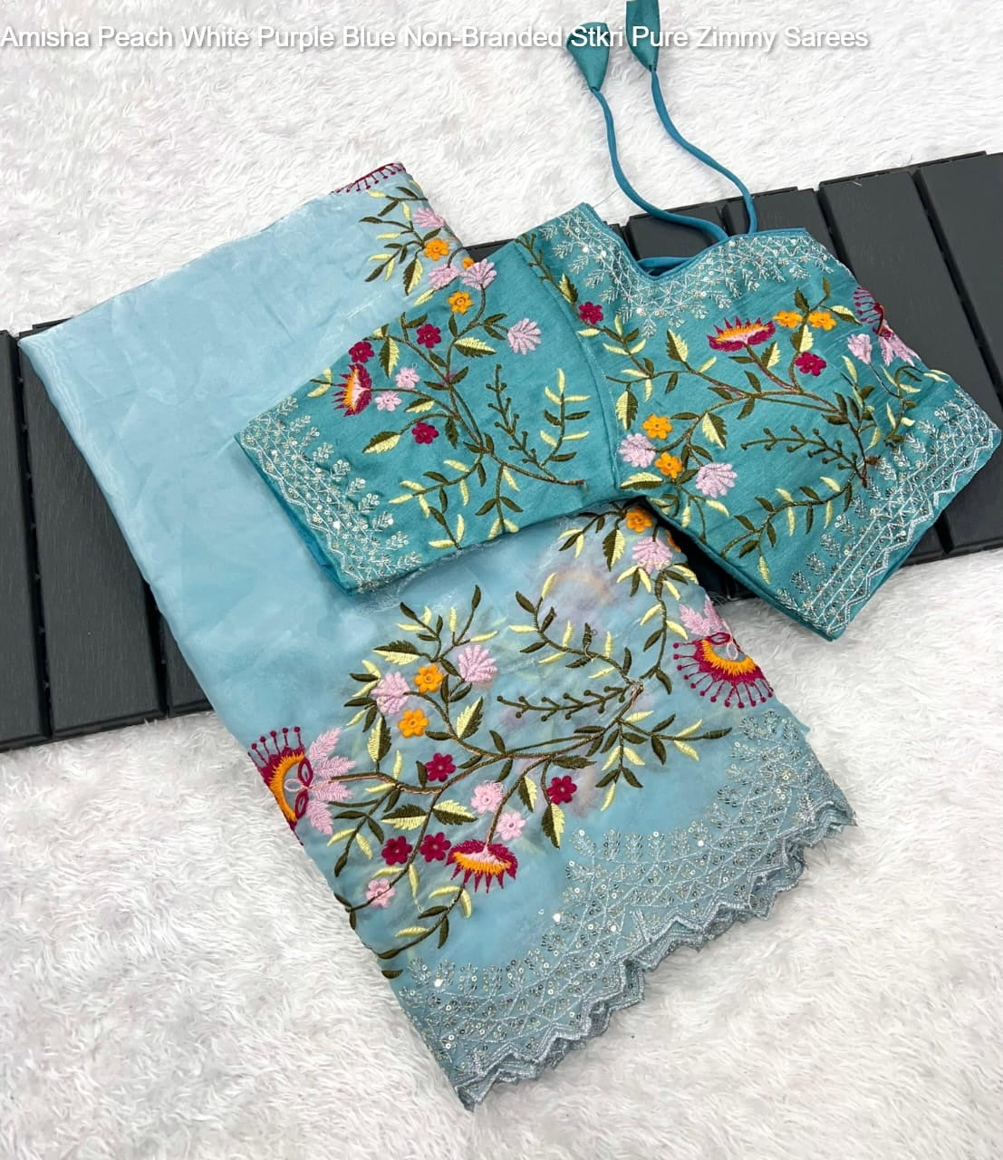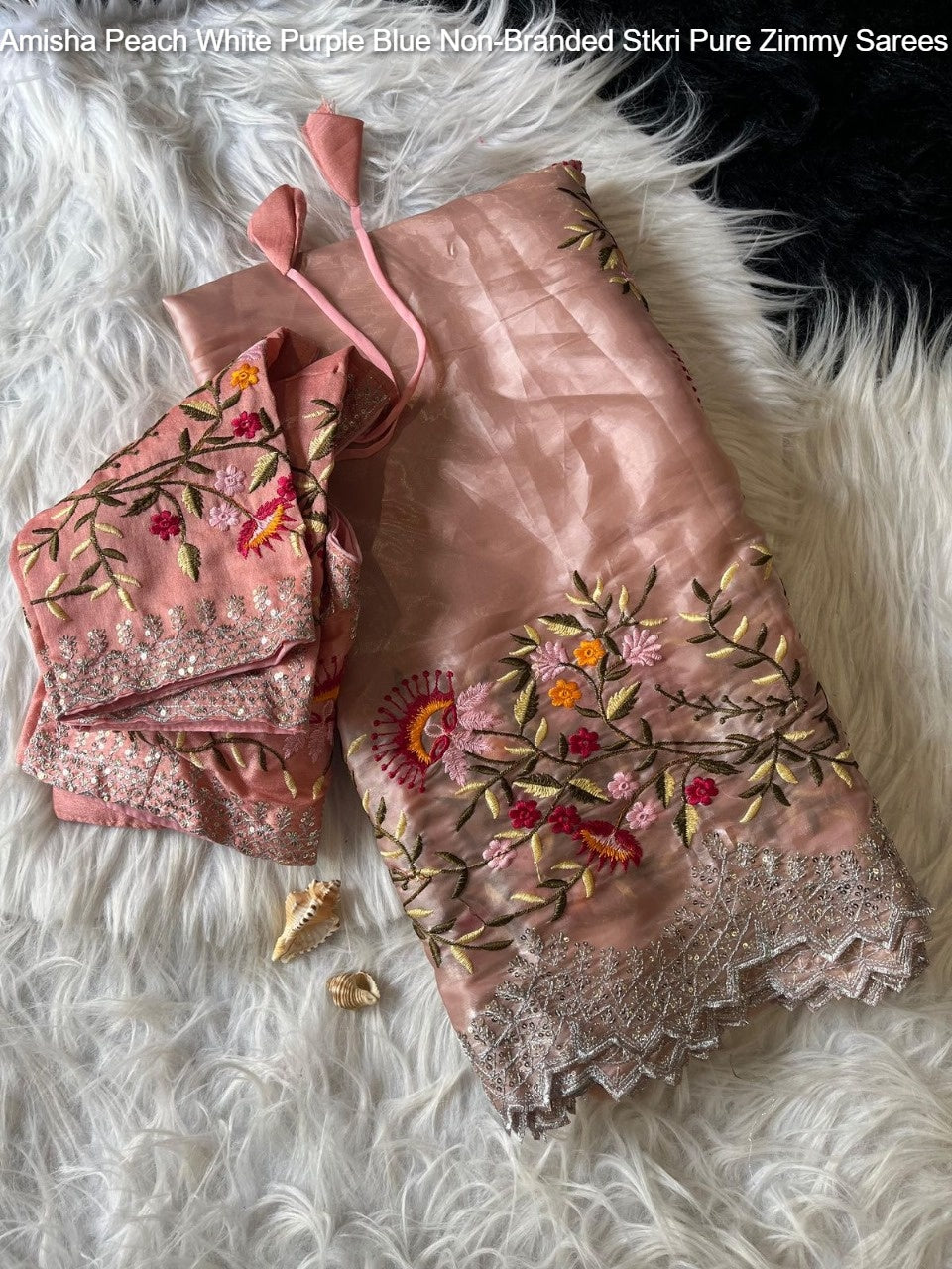 - Amisha Peach White Purple Blue Non-Branded Stkri Pure Zimmy Sarees Dealer Ahmedabad Surat Wholesale Gujarat India Lowest Price Best Quality Buy Purchase Shipping Kurta Salwaar Kameez Also free Cash on delivery
