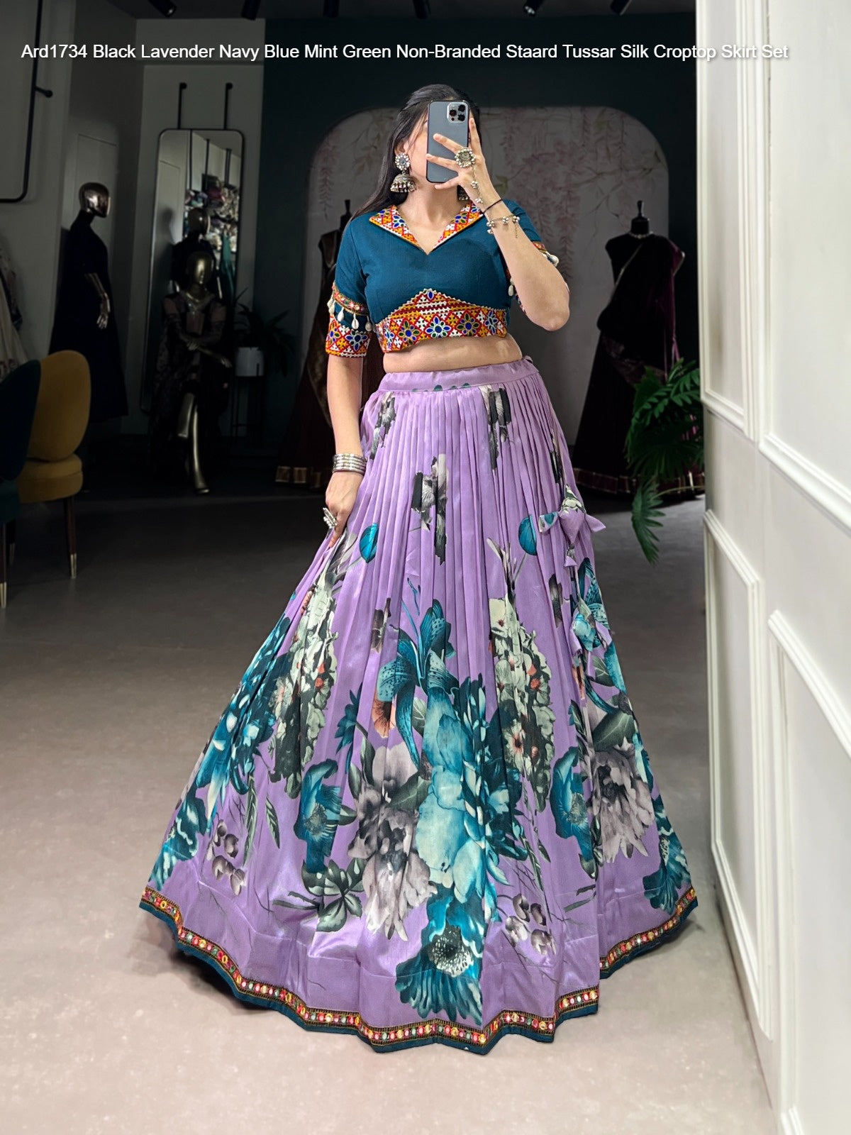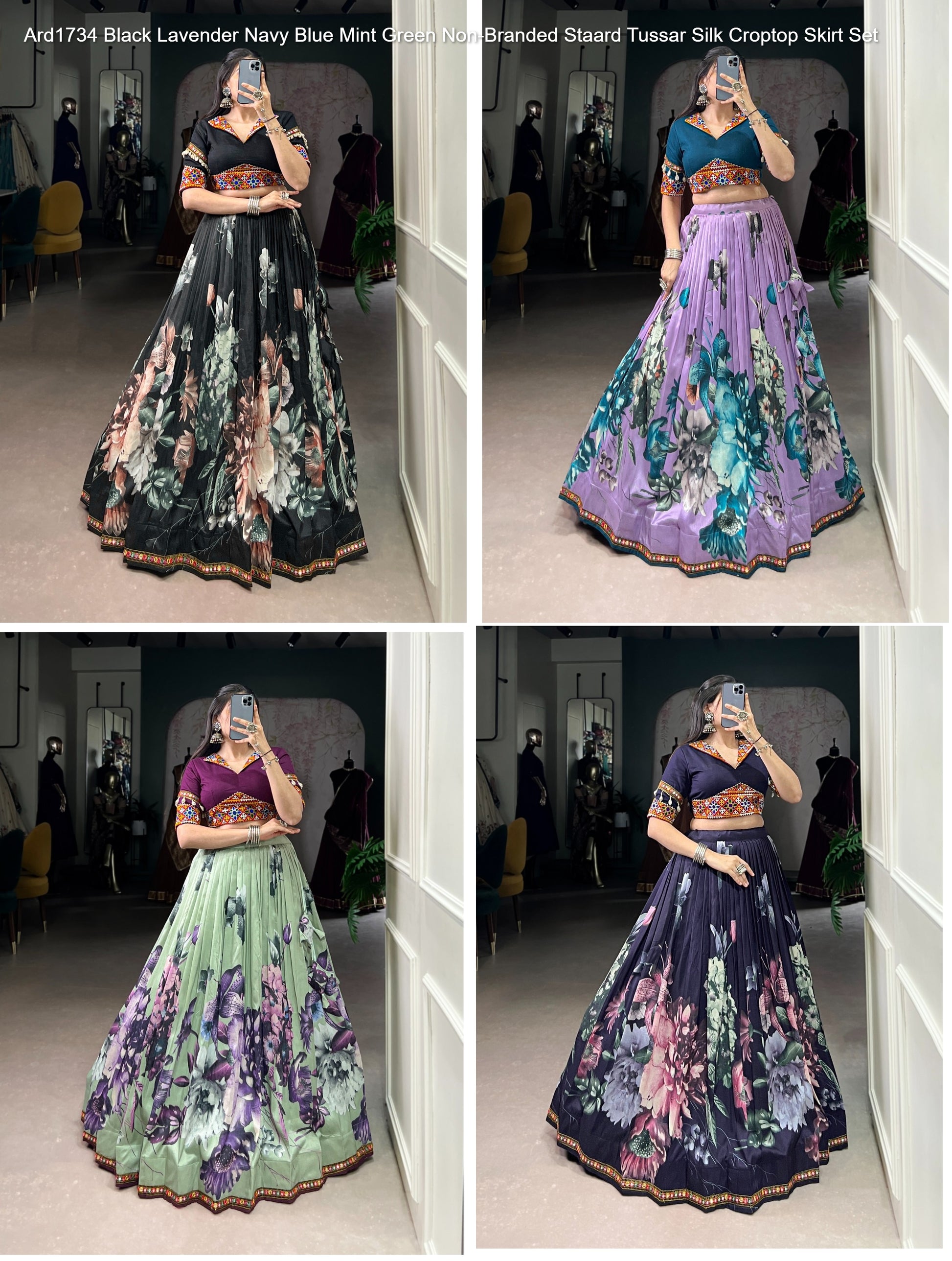 - Ard1734 Black Lavender Navy Blue Mint Green Non-Branded Staard Tussar Silk Croptop Skirt Set Dealer Ahmedabad Surat Wholesale Gujarat India Lowest Price Best Quality Buy Purchase Shipping Kurta Salwaar Kameez Also free Cash on delivery