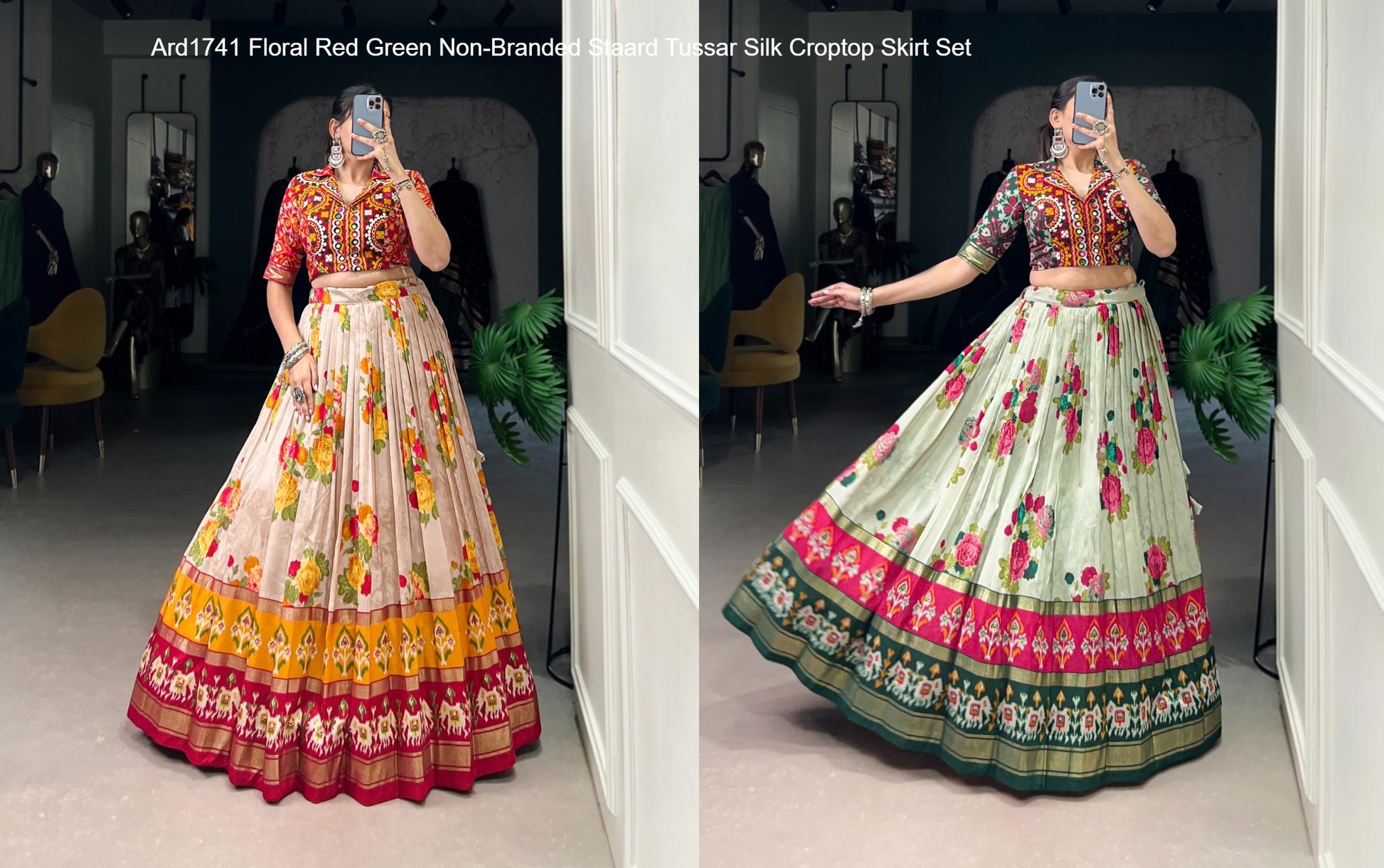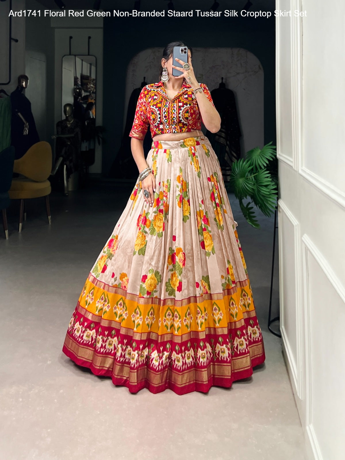 - Ard1741 Floral Red Green Non-Branded Staard Tussar Silk Croptop Skirt Set Dealer Ahmedabad Surat Wholesale Gujarat India Lowest Price Best Quality Buy Purchase Shipping Kurta Salwaar Kameez Also free Cash on delivery