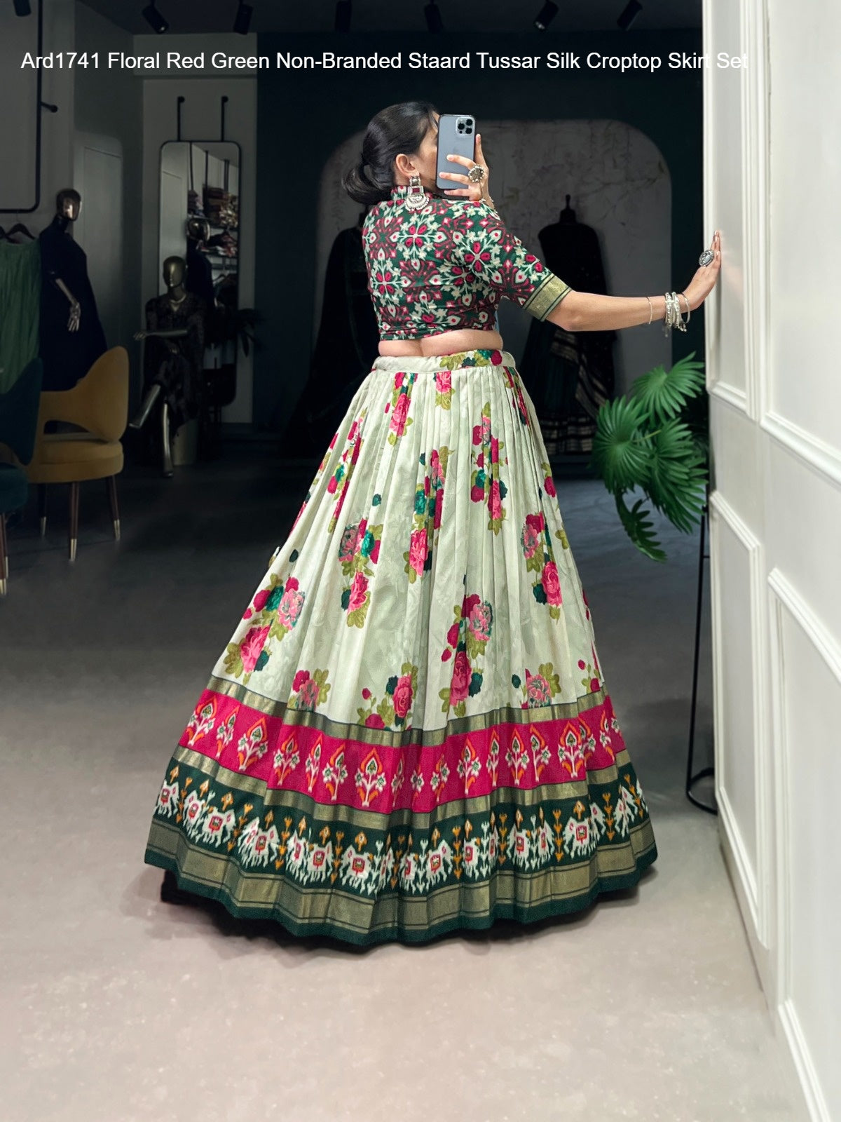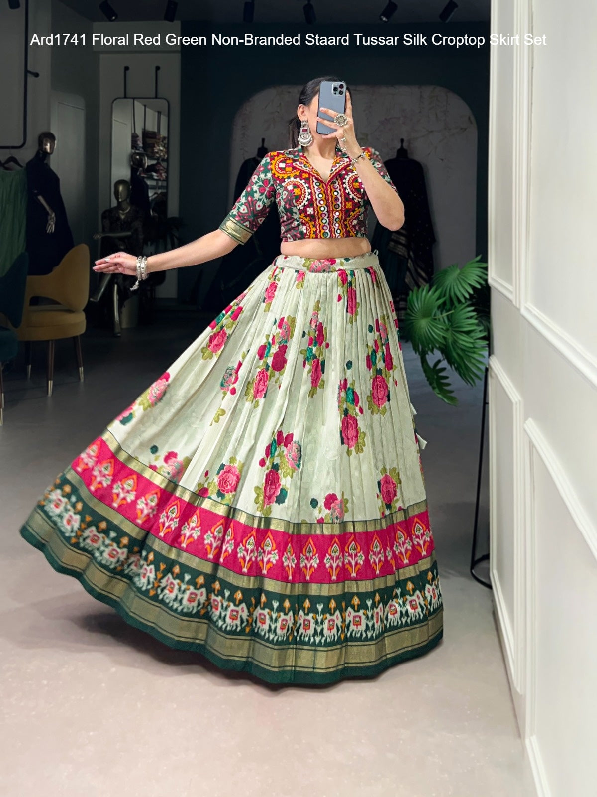 Ard1741 Floral Red Green Non-Branded Staard Tussar Silk Croptop Skirt Set