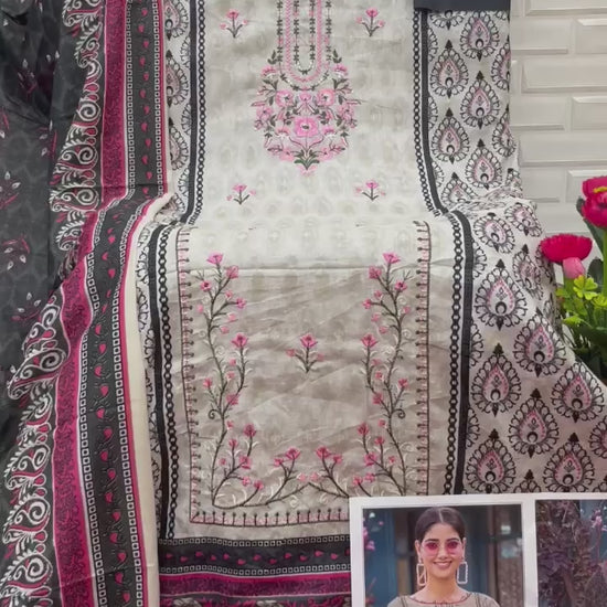 - Fabric Detail: Top : Pure Cotton Print With Embroidery Self Work , Bottom : Semi Lawn , Dupatta : Cotton Printed ,