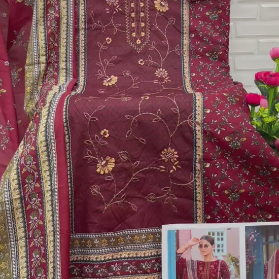 - Fabric Detail: Top : Pure Cotton Print With Embroidery Self Work , Bottom : Semi Lawn , Dupatta : Cotton Printed ,