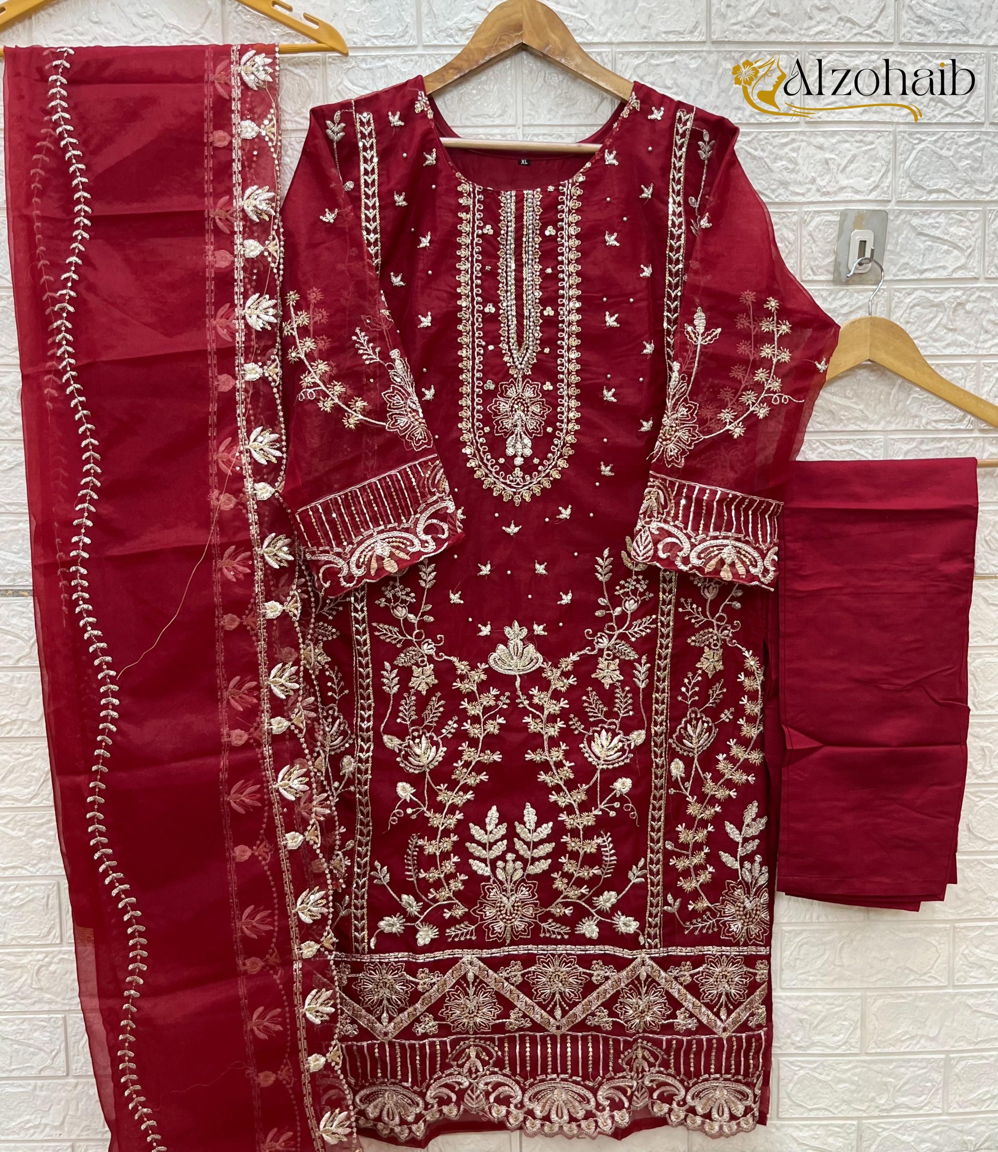 - Fabric Detail: Top : Organza With Work And Full Khatli Work , Bottom And Inner : Dull Santoon , Dupatta : Organza With Work , Size : Xl, 2Xl