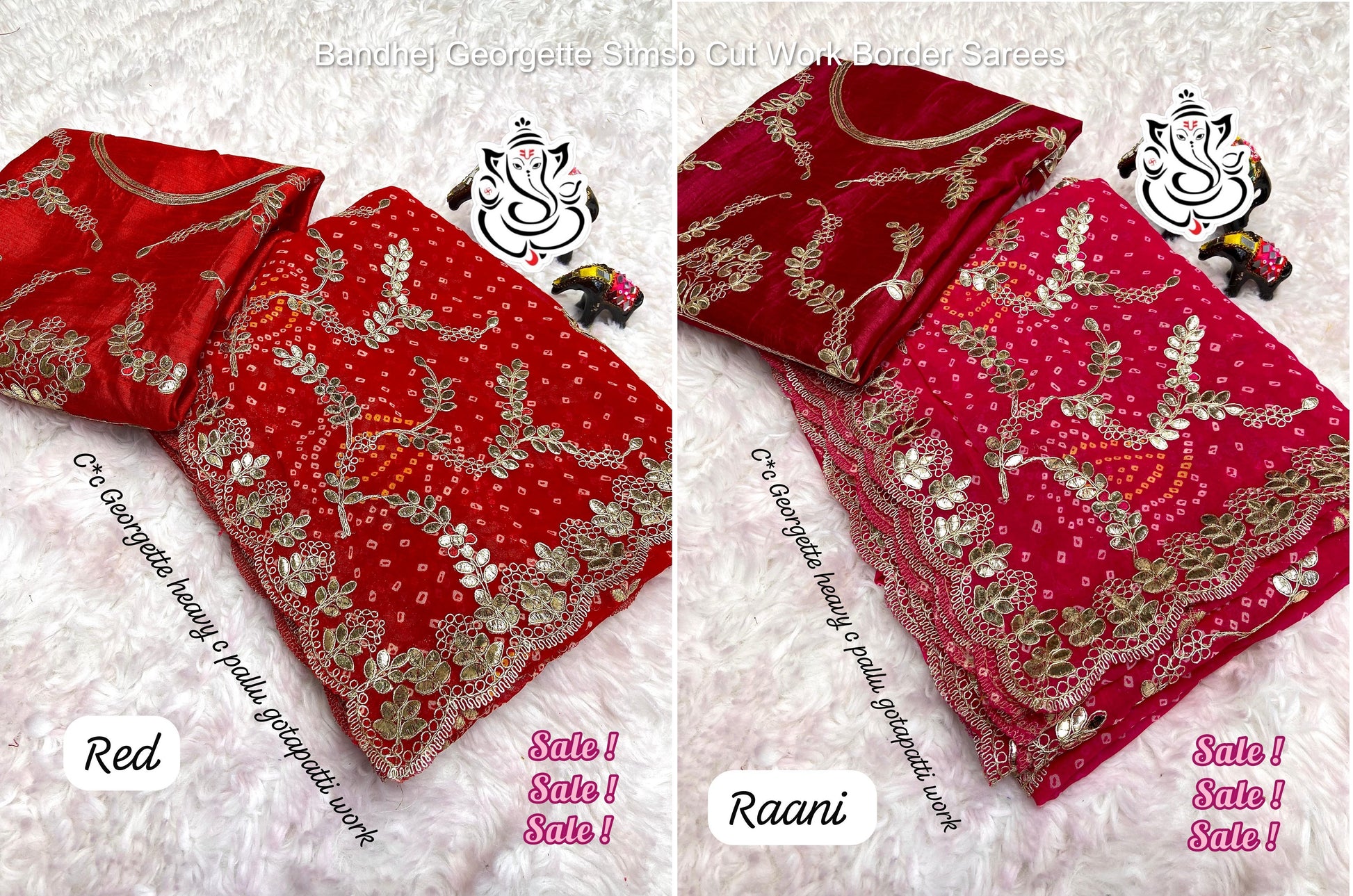 - Bandhej Georgette Stmsb Cut Work Border Sarees Dealer Ahmedabad Surat Wholesale Gujarat India Lowest Price Best Quality Buy Purchase Shipping Kurta Salwaar Kameez Also free Cash on delivery