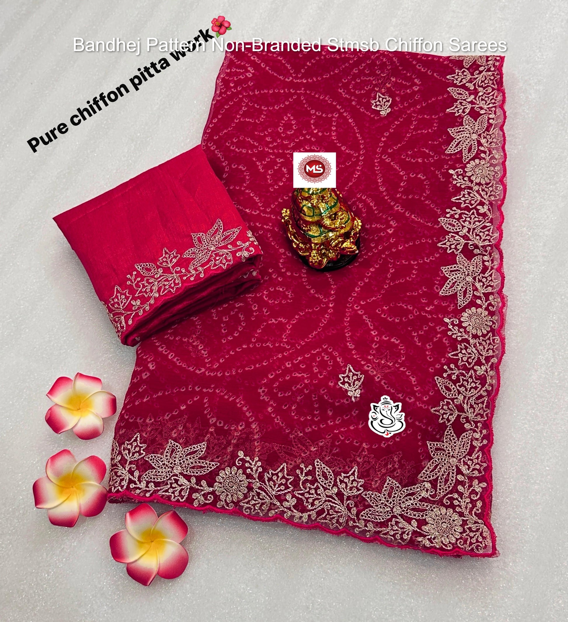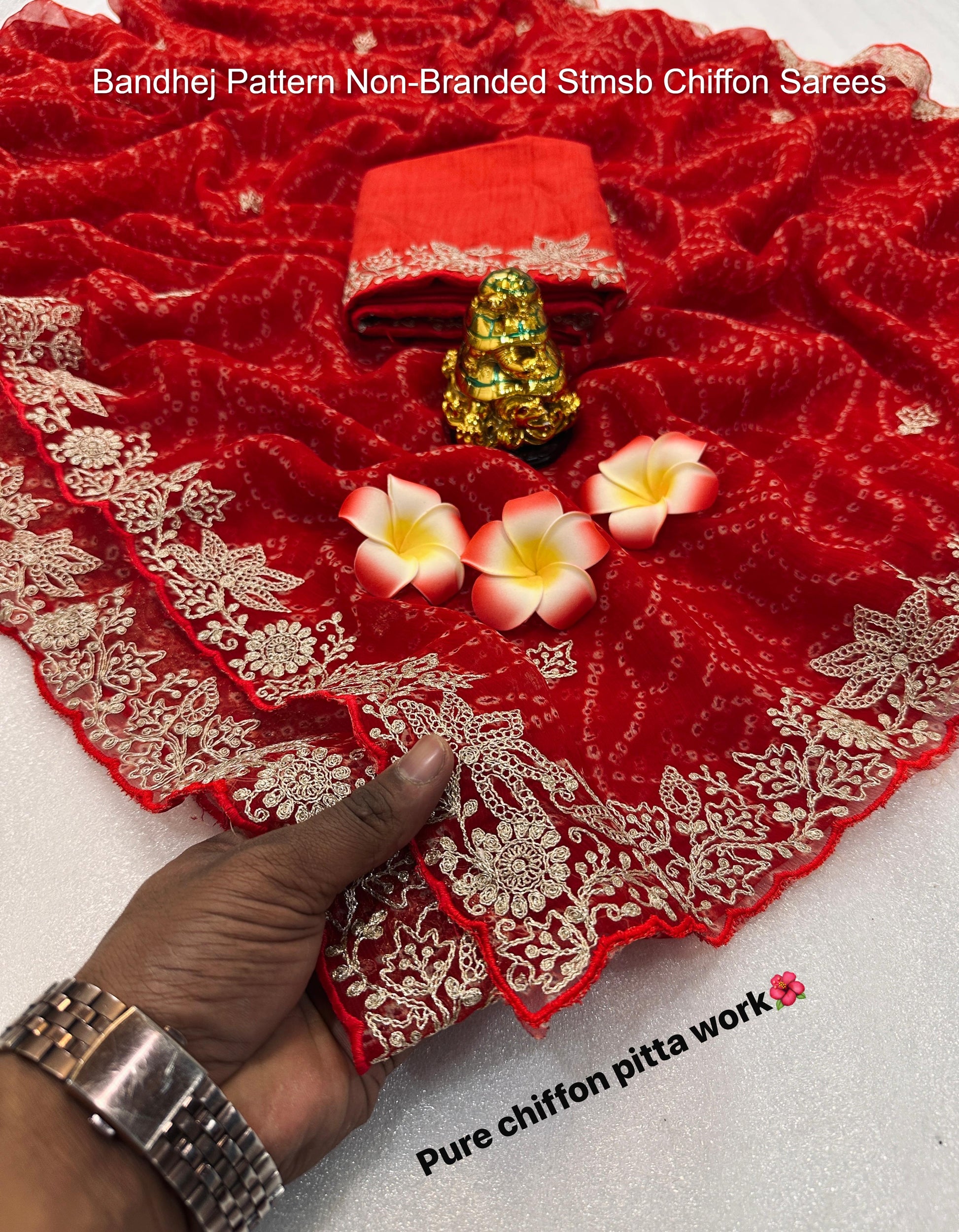 - Bandhej Pattern Non-Branded Stmsb Chiffon Sarees Dealer Ahmedabad Surat Wholesale Gujarat India Lowest Price Best Quality Buy Purchase Shipping Kurta Salwaar Kameez Also free Cash on delivery