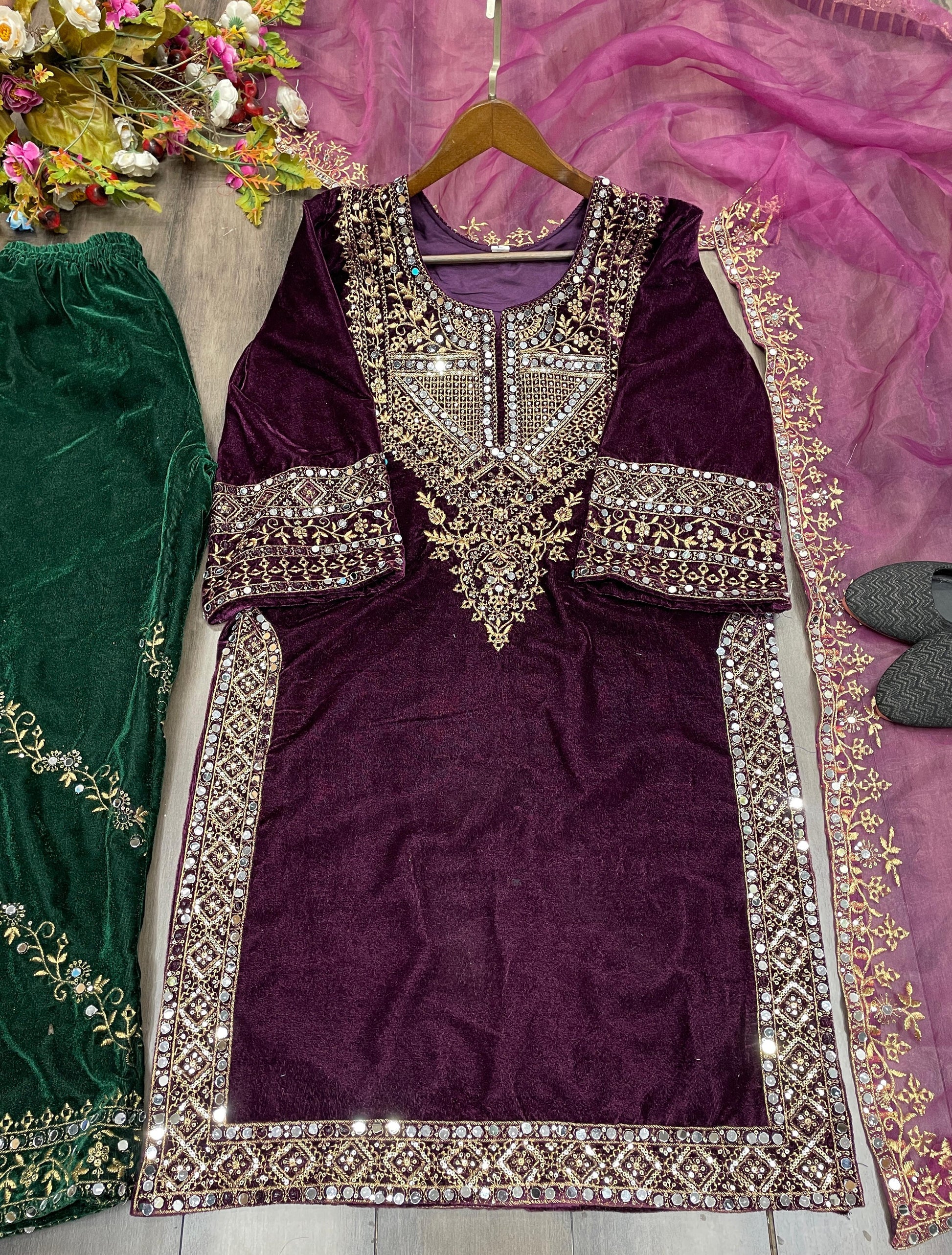 - Fabric Detail: Top : Viscose Velvet Sequence Embroidery Work With Mirror Work, Length : 42 Apx, Bottom : Velvet With Sequence Embroidery Work With Mirror Work Full Stitched, Length : 39 Apx, Dupatta : Organza With Sequence Embroidered Work And Mirror Work, Cut : 2.2 Mtr , Size : M, L, Xl, 2Xl