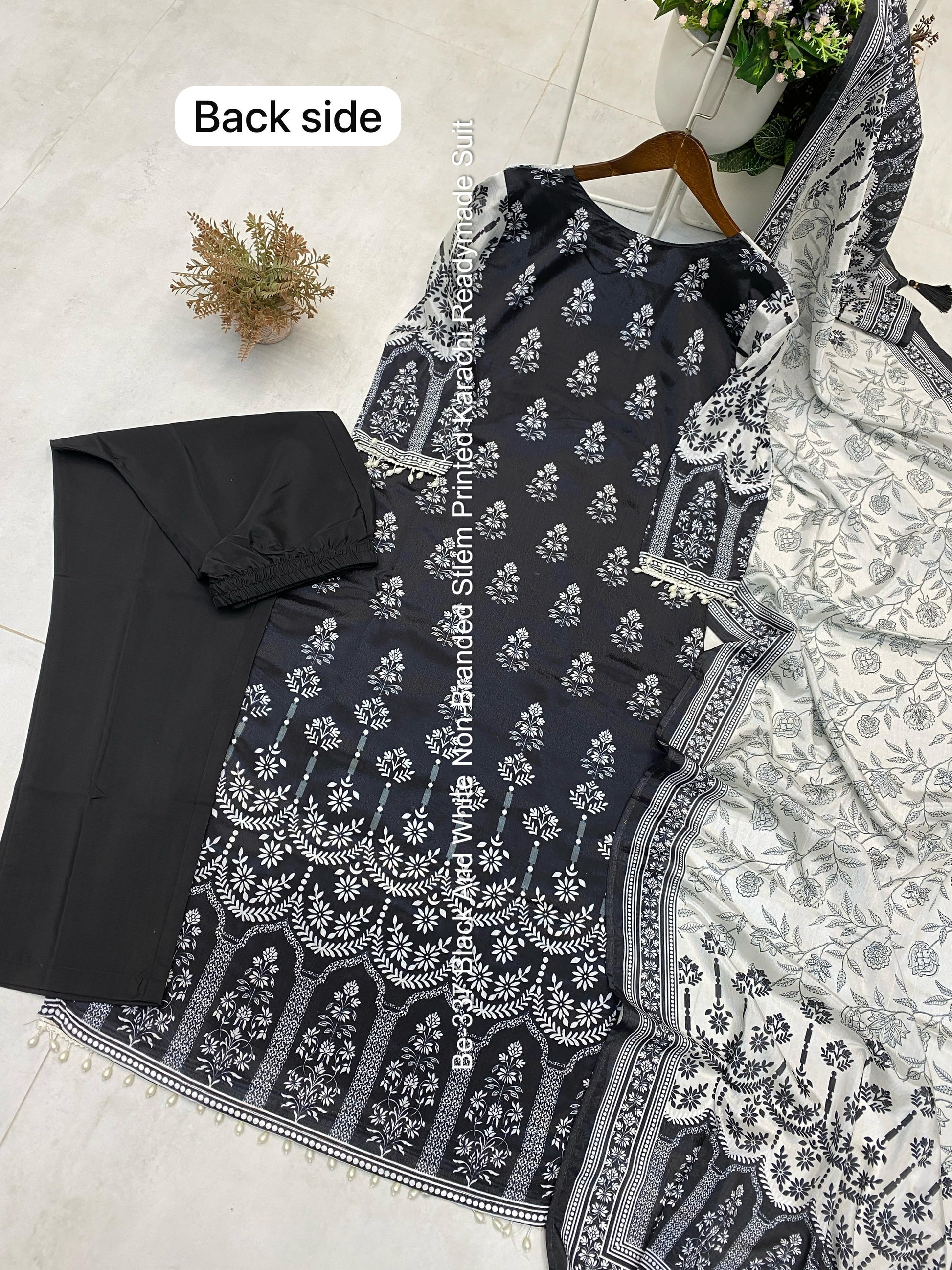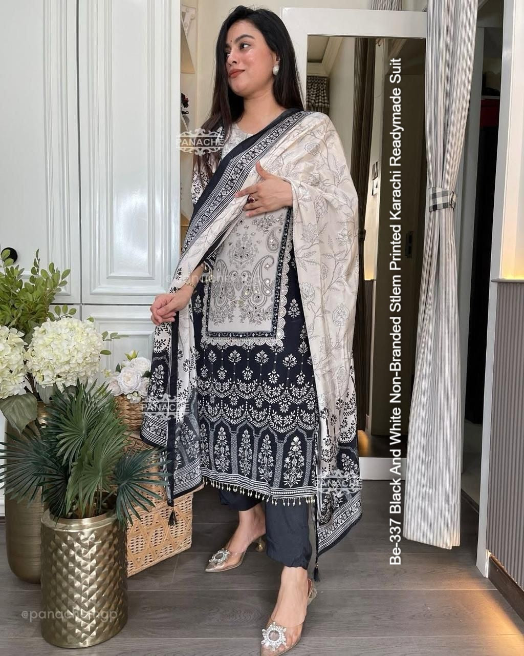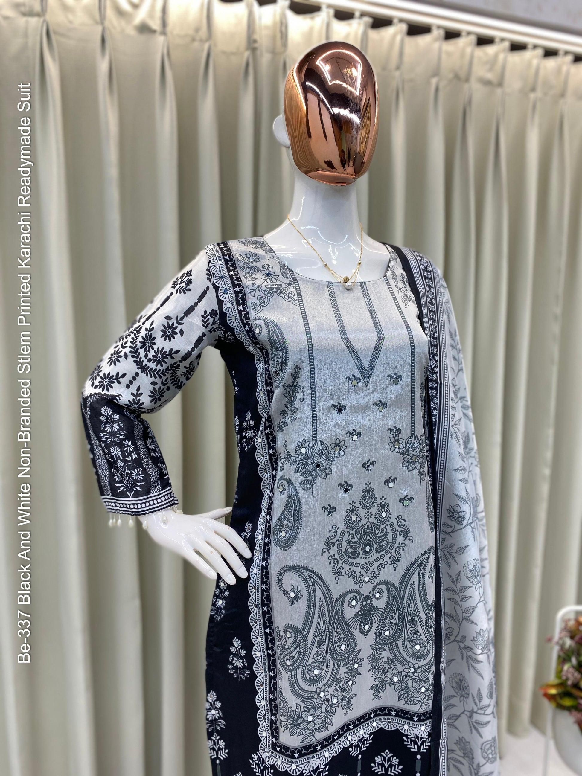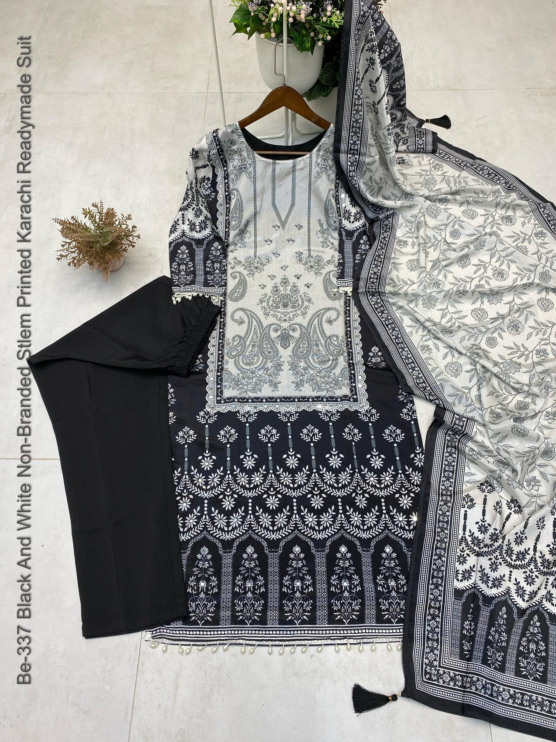 Be-337 Black And White Non-Branded Stlem Printed Karachi Readymade Suit