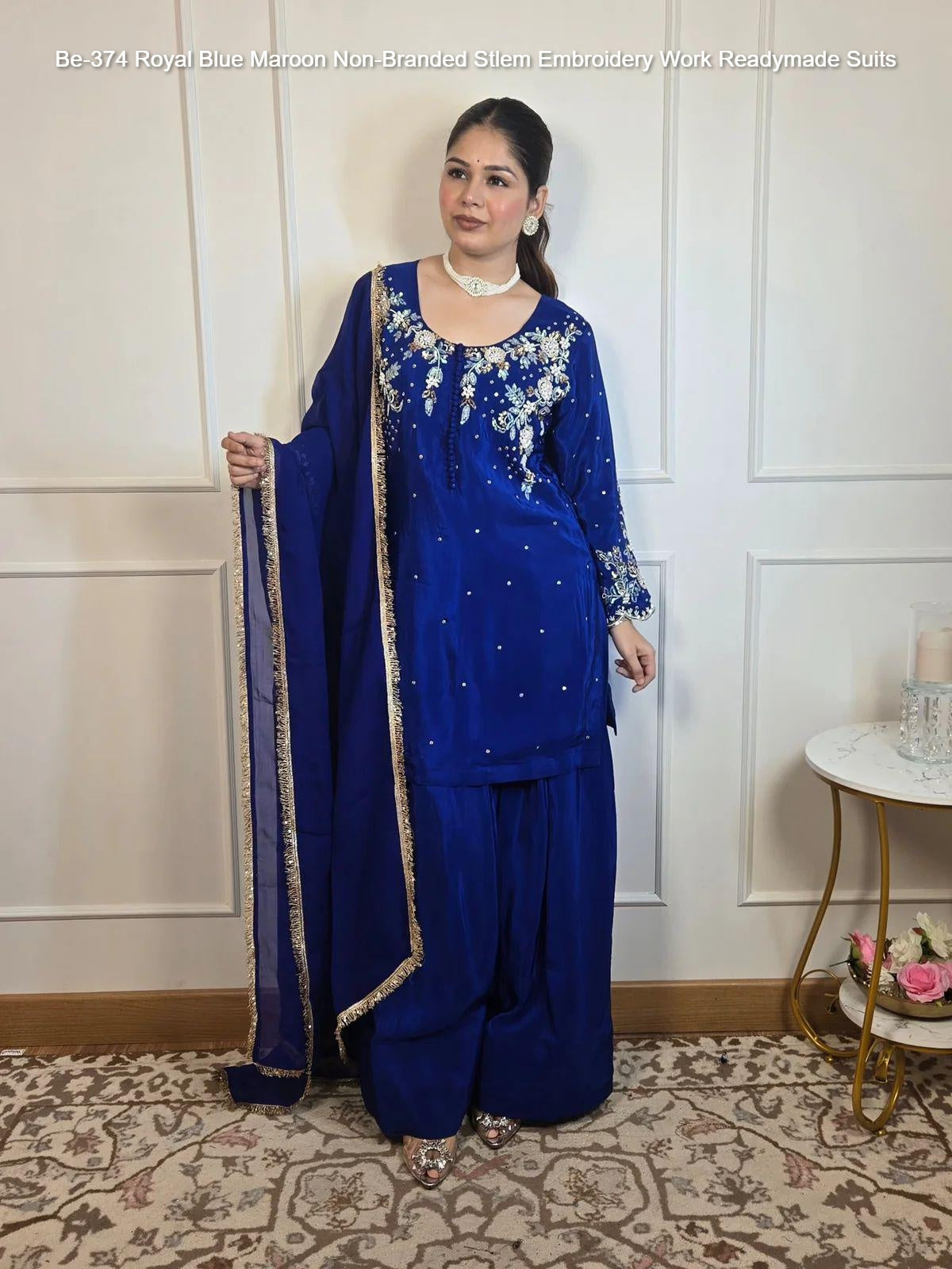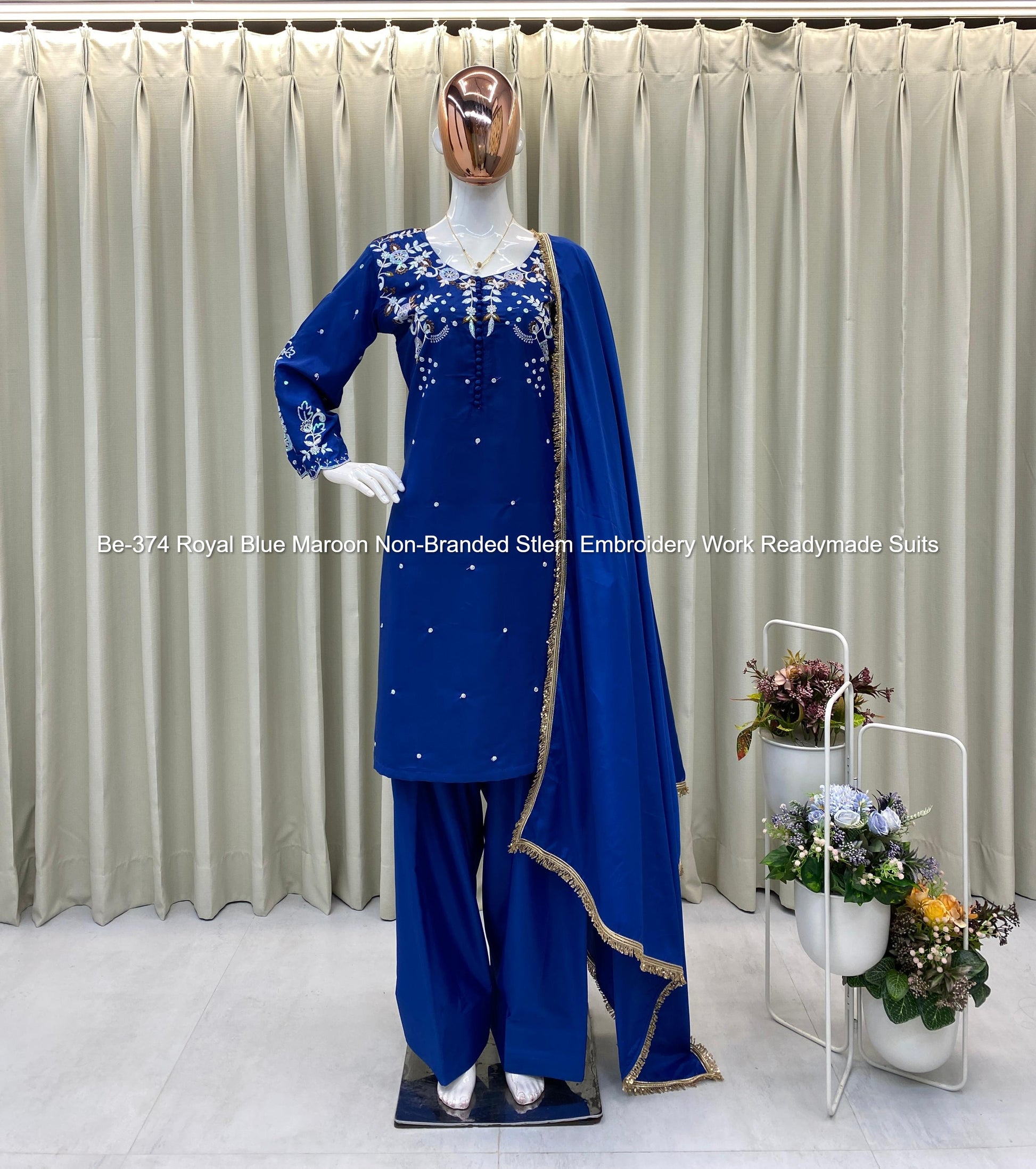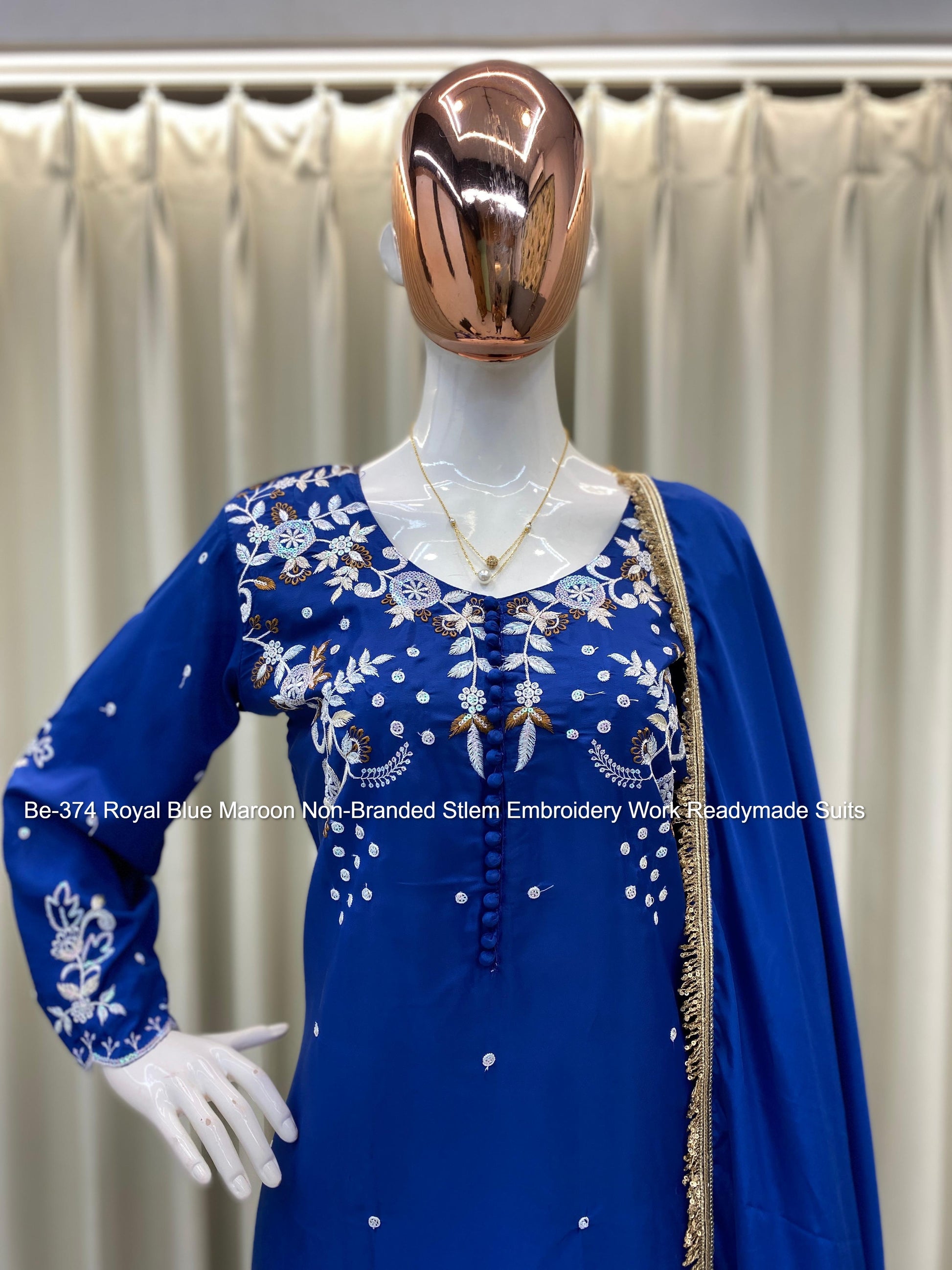 Be-374 Royal Blue Maroon Non-Branded Stlem Embroidery Work Readymade Suits