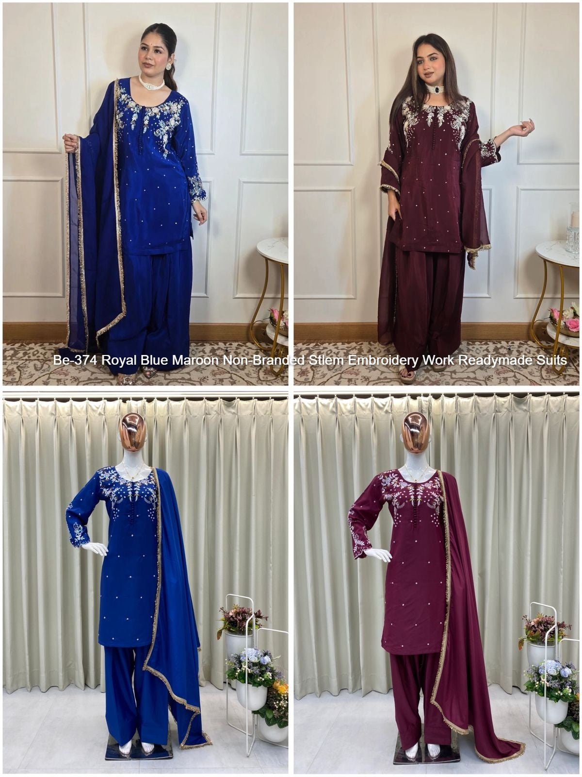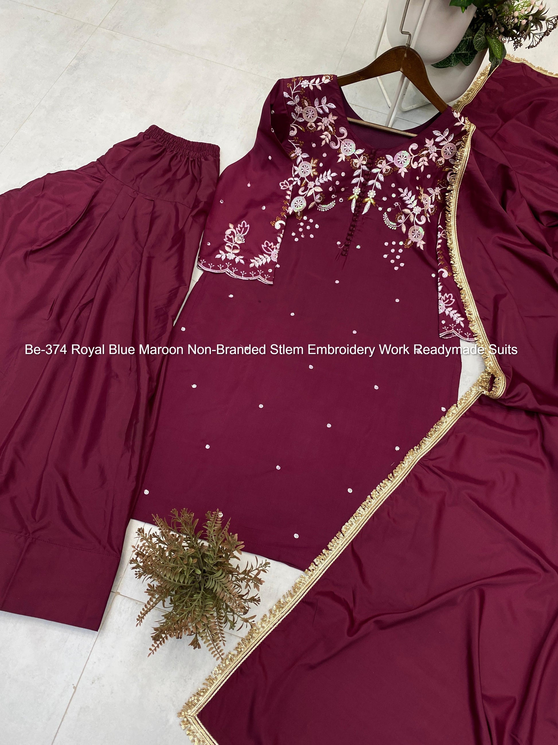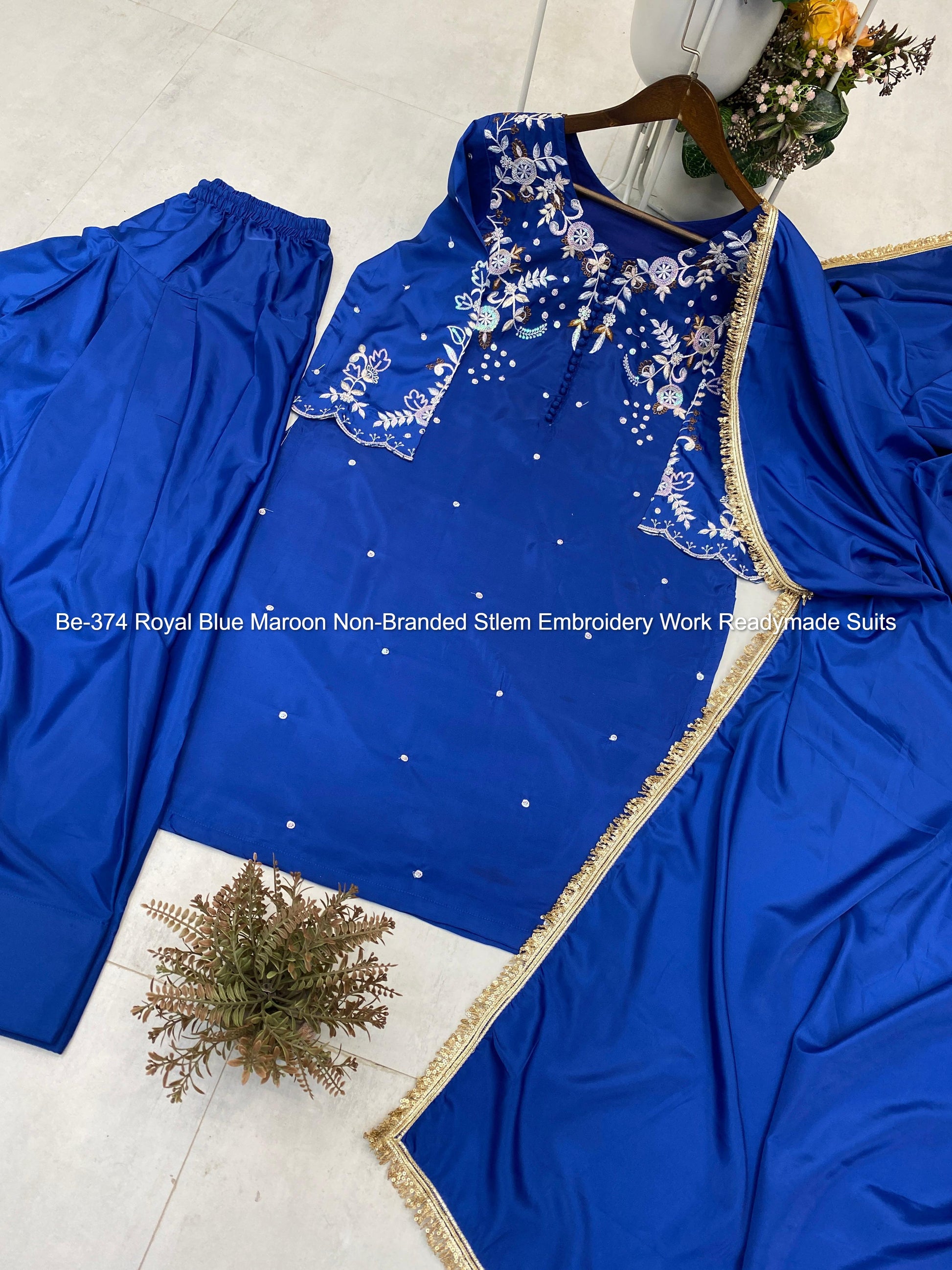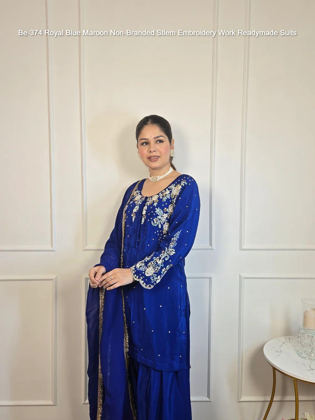 Be-374 Royal Blue Maroon Non-Branded Stlem Embroidery Work Readymade Suits