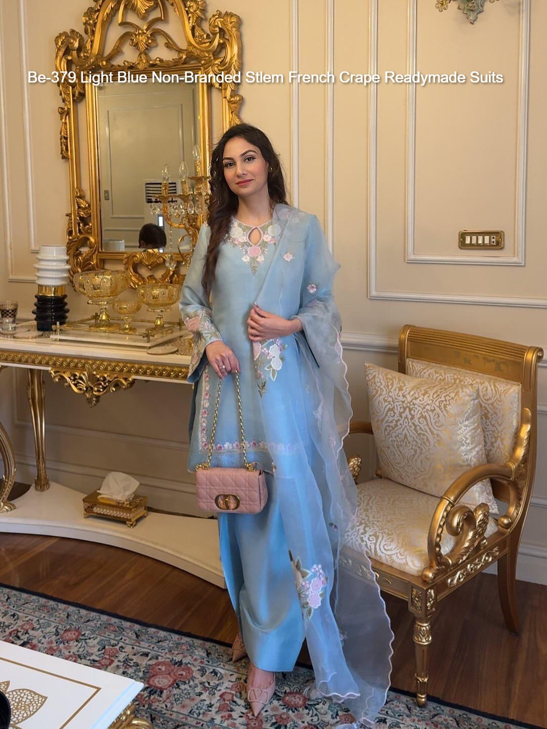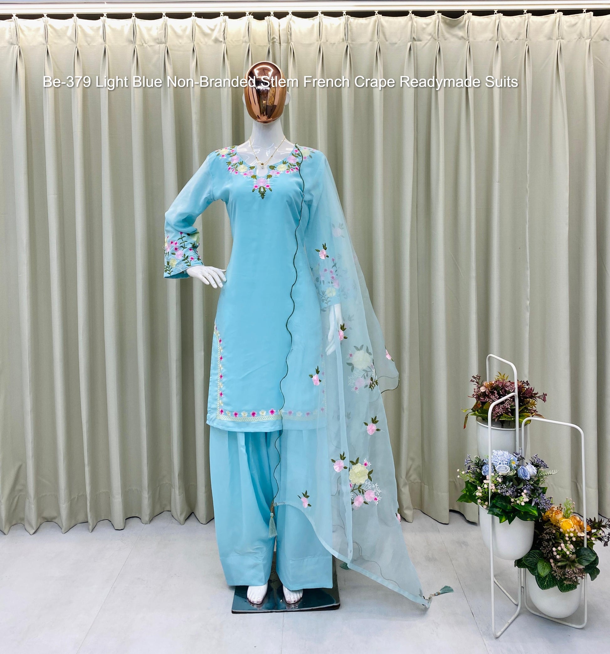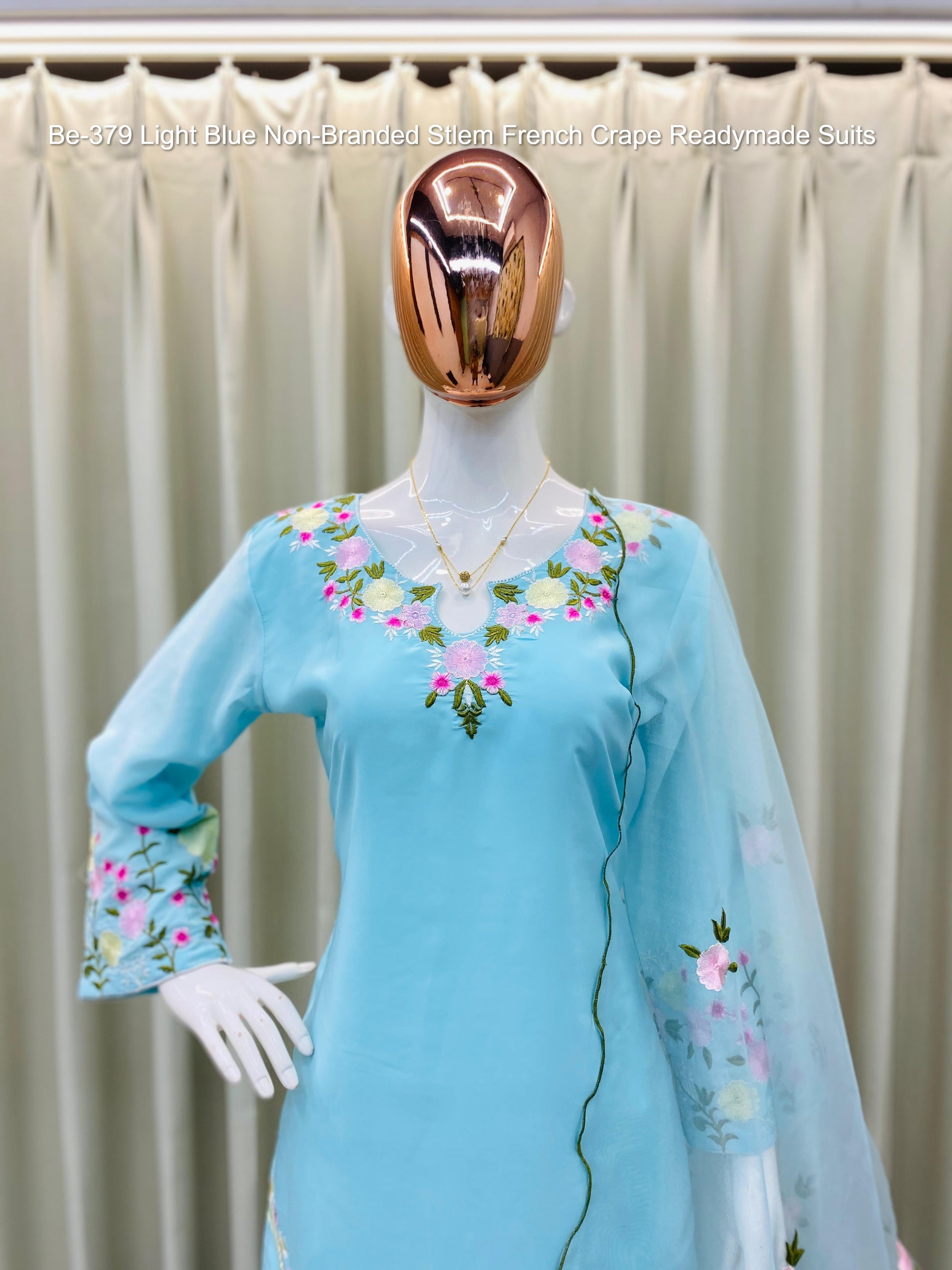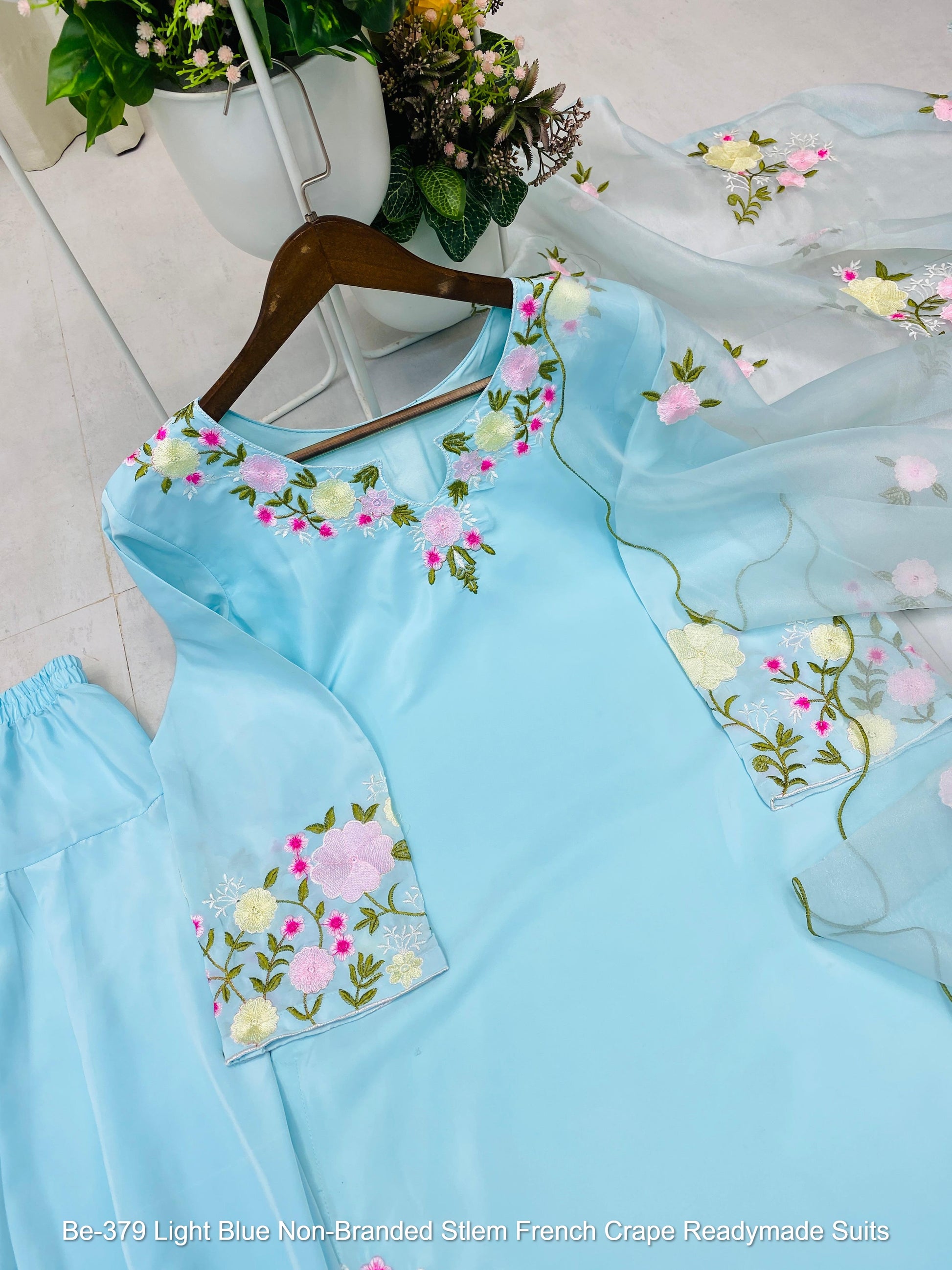 Be-379 Light Blue Non-Branded Stlem French Crape Readymade Suits
