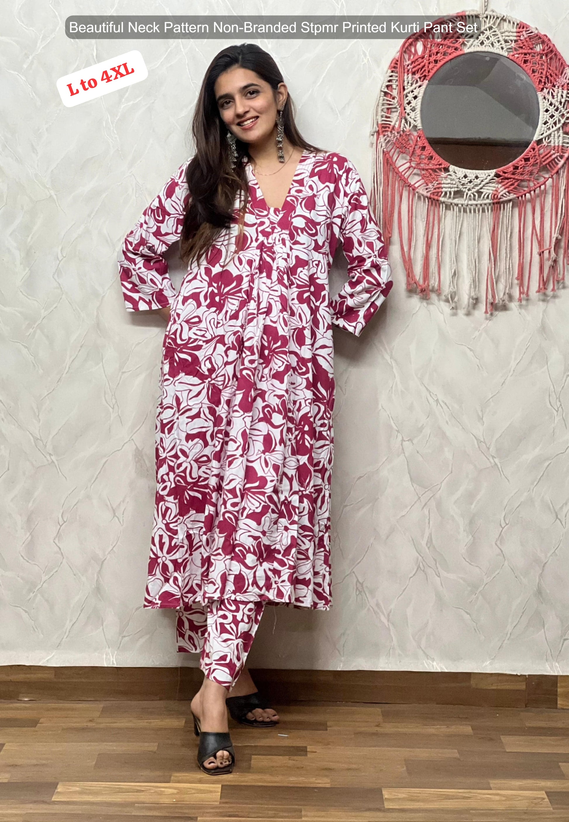 Beautiful Neck Pattern Non-Branded Stpmr Printed Kurti Pant Set