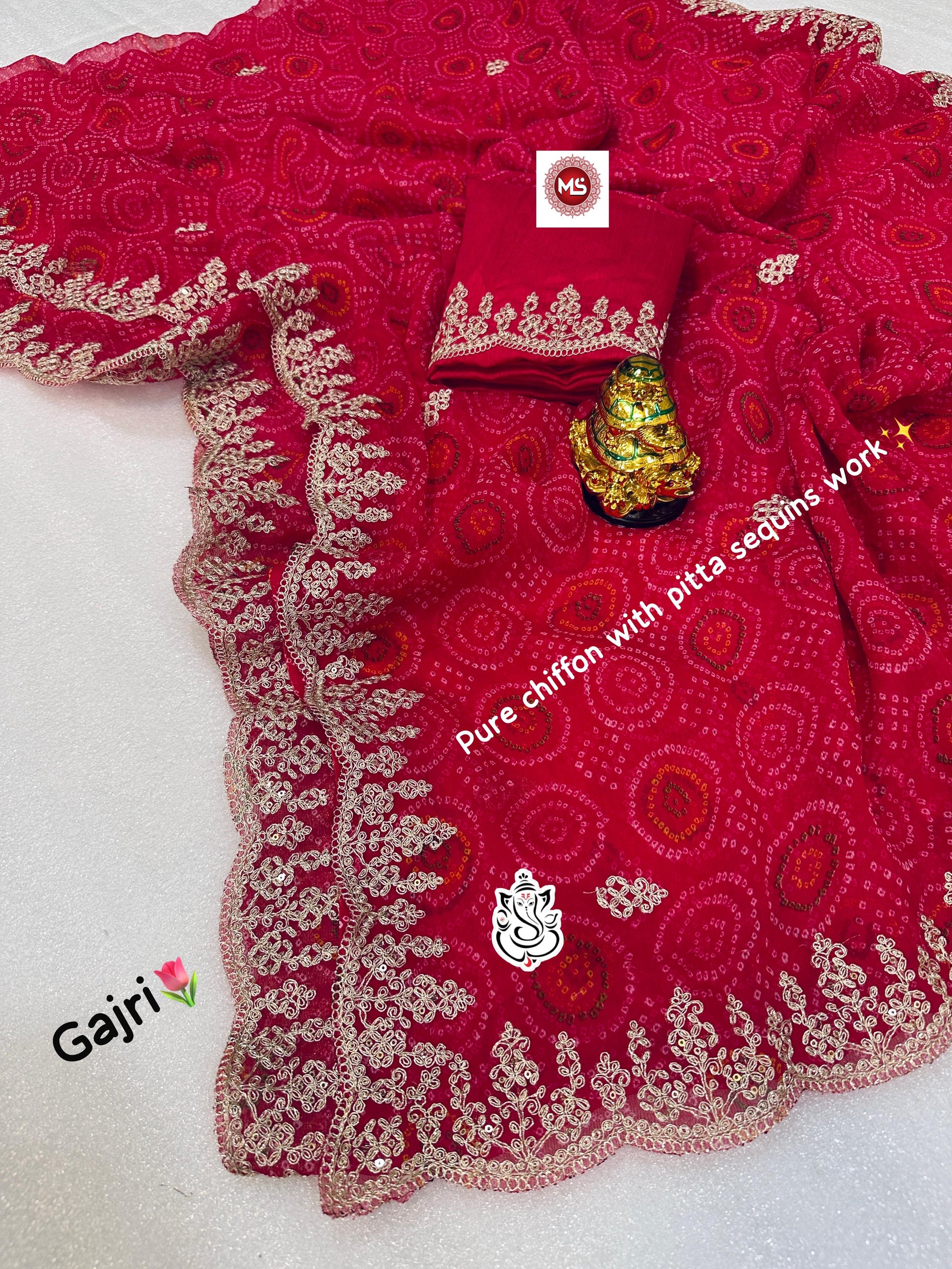 - Fabric Detail: Saree : Pure Blooming Chiffon Coding Sequence C Pallu Embroidery Work Beautiful Cut Work Border Zari Work Bandhej Mill Print Pattern , Blouse : Banglori Silk , ,