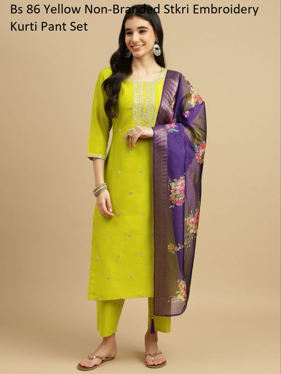 - Bs 86 Yellow Non-Branded Stkri Embroidery Kurti Pant Set Dealer Ahmedabad Surat Wholesale Gujarat India Lowest Price Best Quality Buy Purchase Shipping Kurta Salwaar Kameez Also free Cash on delivery
