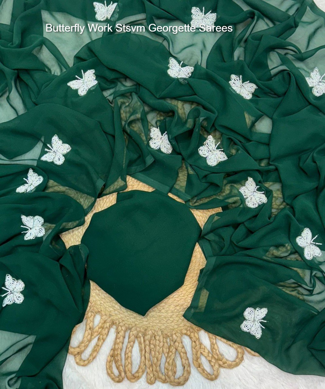 - Fabric Detail: Saree : Georgette Butterfly Beads Moti Handwork Dark Colour,Full Length : 6.30 Mtr , Blouse : Running , ,
