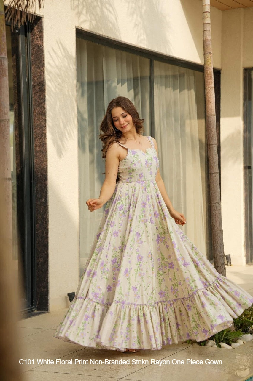 - C101 White Floral Print Non-Branded Stnkn Rayon One Piece Gown Dealer Ahmedabad Surat Wholesale Gujarat India Lowest Price Best Quality Buy Purchase Shipping Kurta Salwaar Kameez Also free Cash on delivery