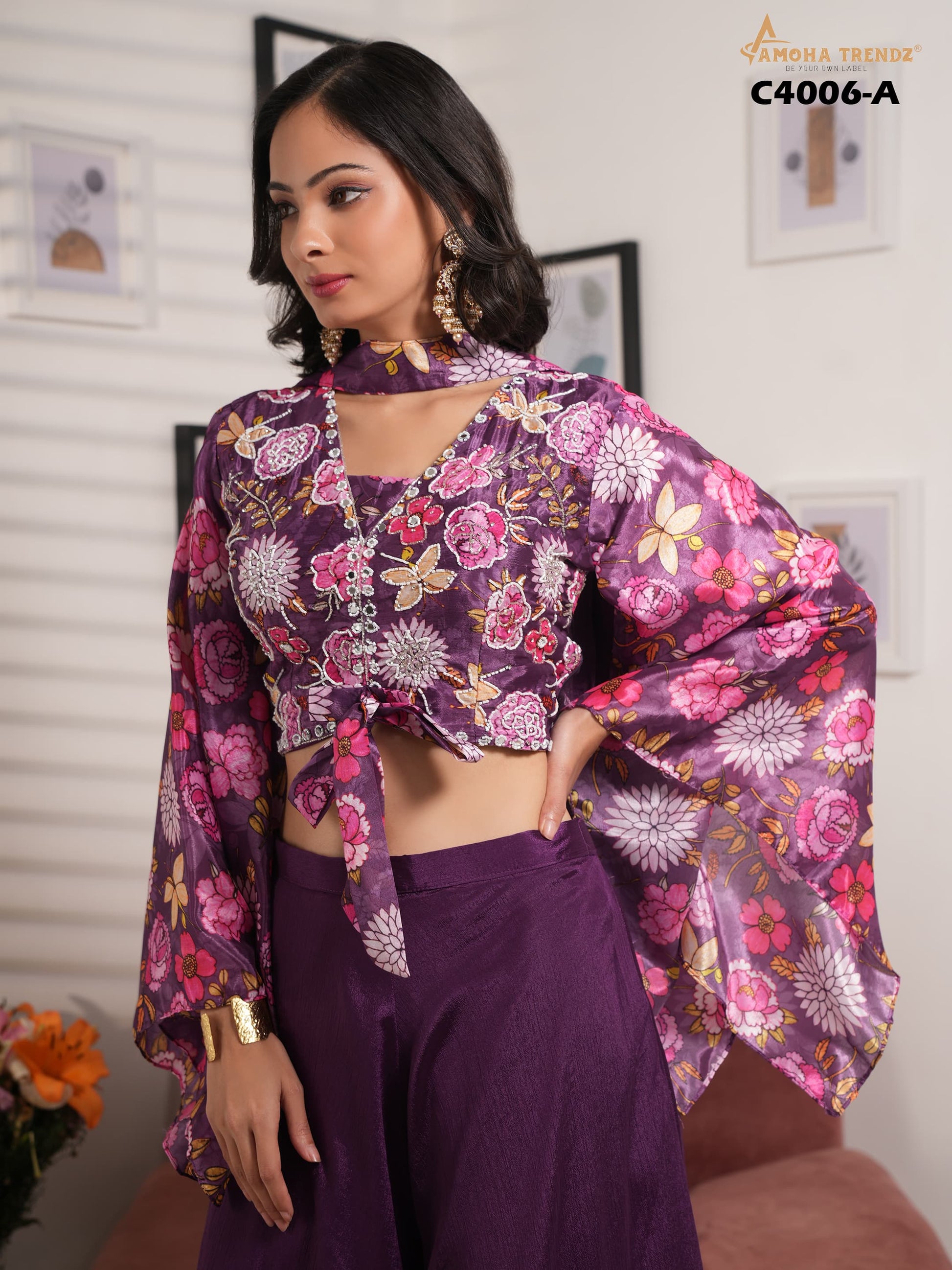 - C4006-A Purple Amoha Printed Crop Top Plazzo Set Dealer Ahmedabad Surat Wholesale Gujarat India Lowest Price Best Quality Buy Purchase Shipping Kurta Salwaar Kameez Also free Cash on delivery