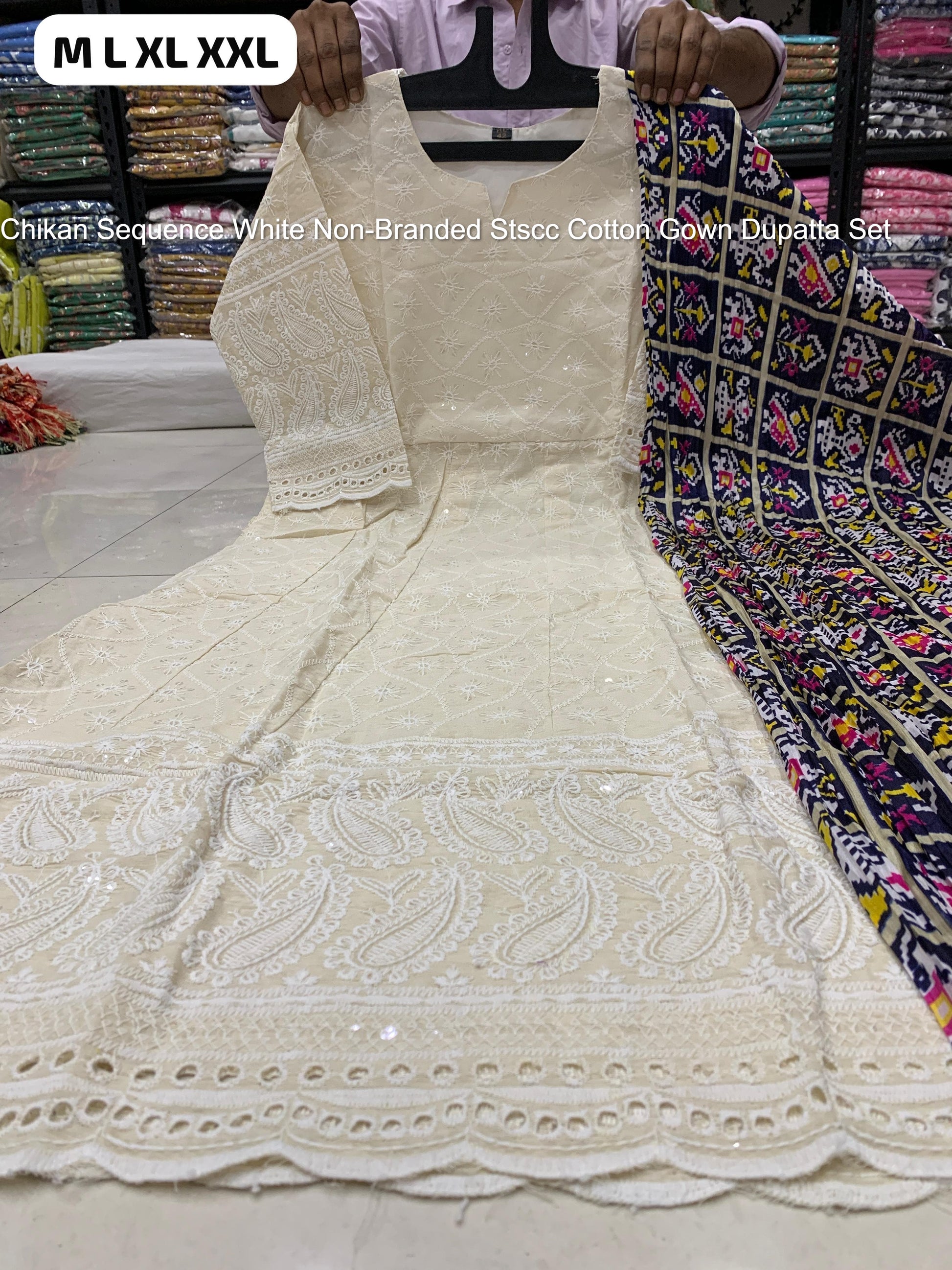 Chikan Sequence White Non-Branded Stscc Cotton Gown Dupatta Set