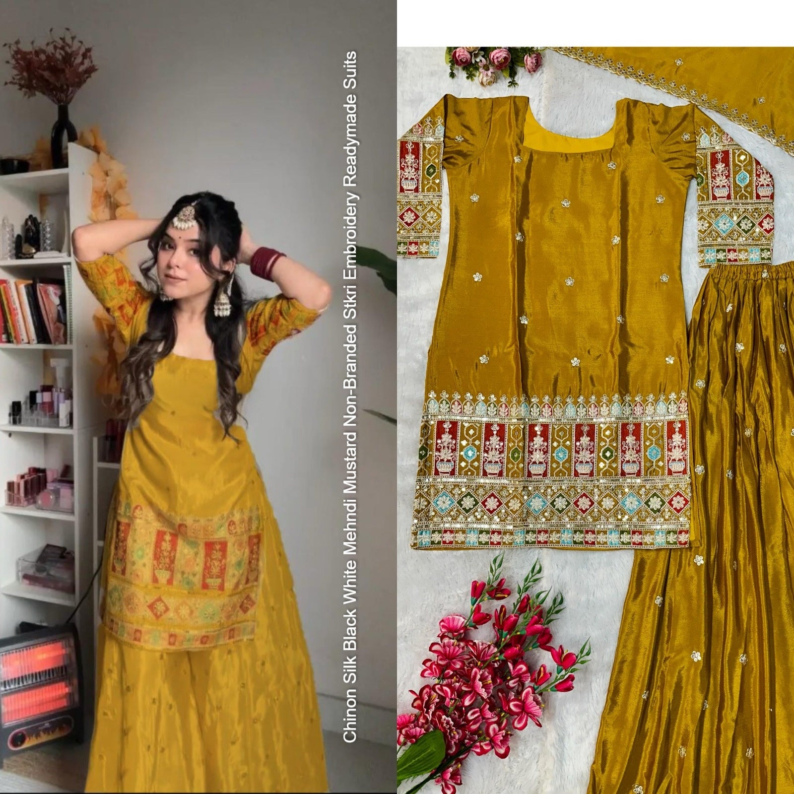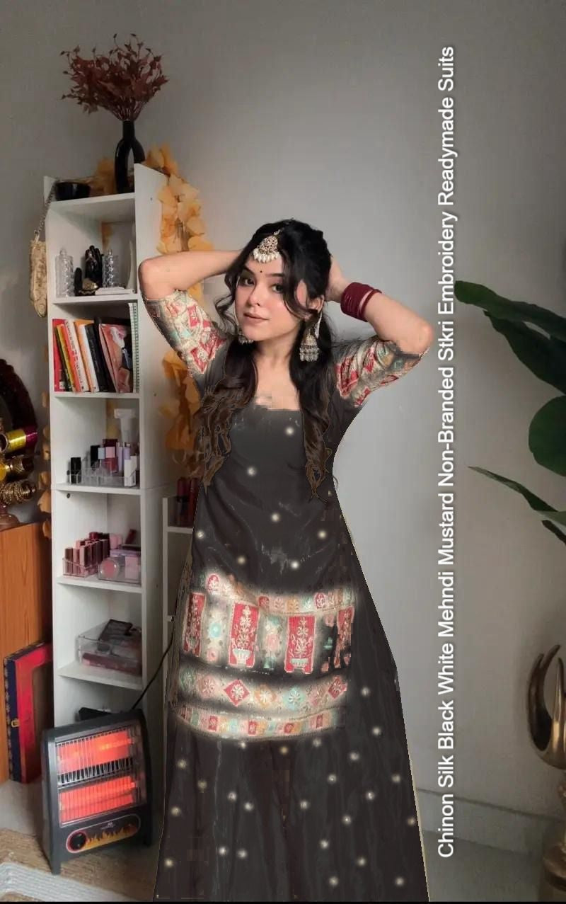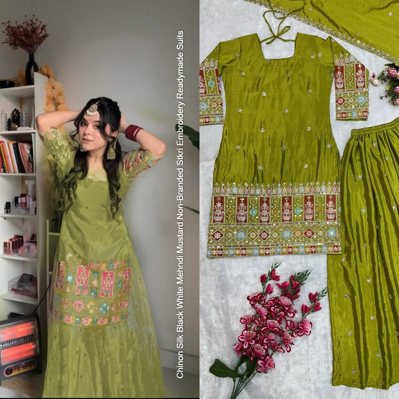 Chinon Silk Black White Mehndi Mustard Non-Branded Stkri Embroidery Readymade Suits