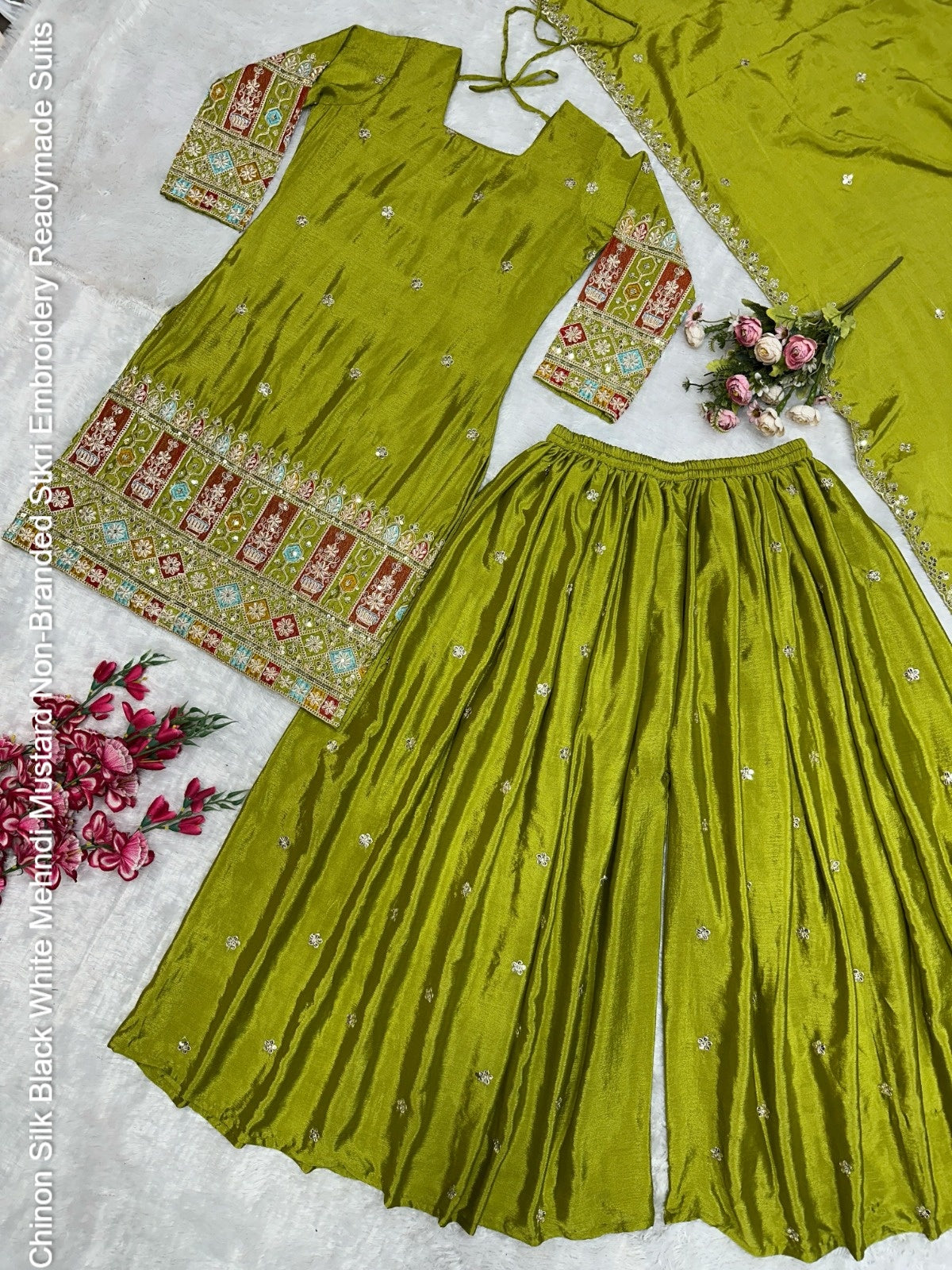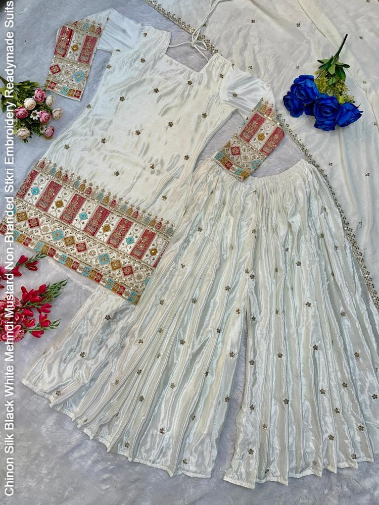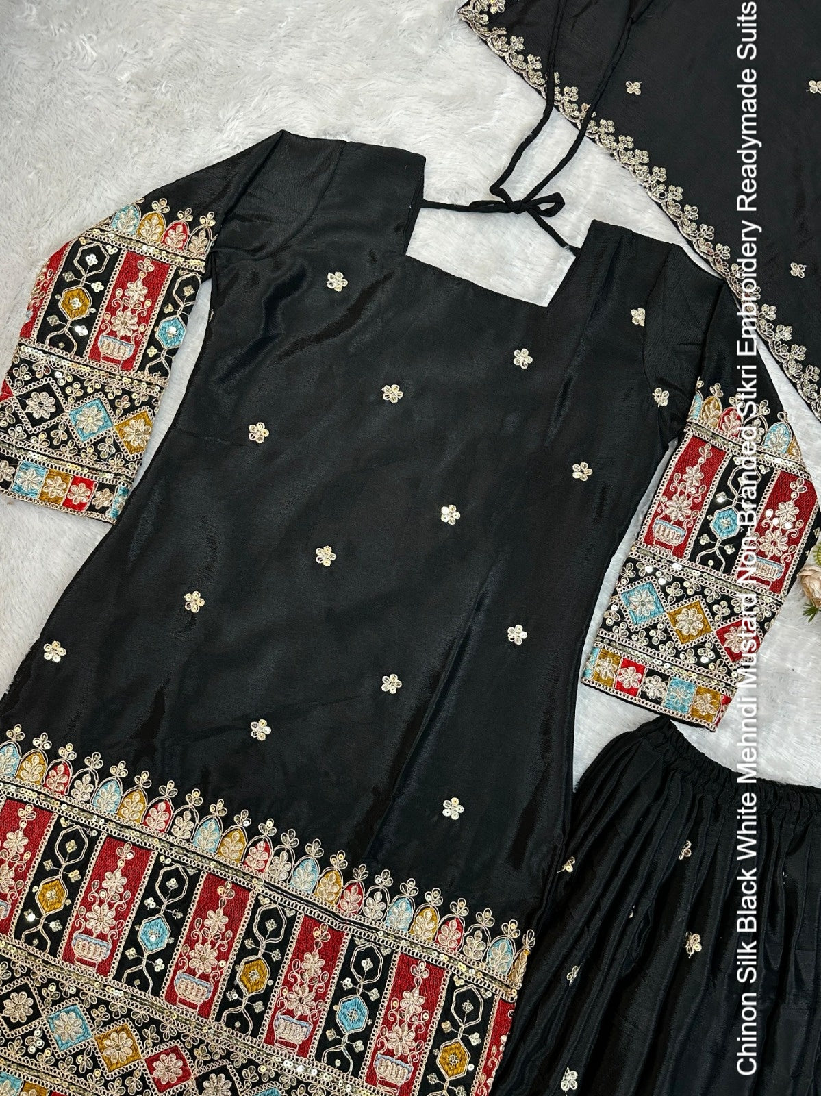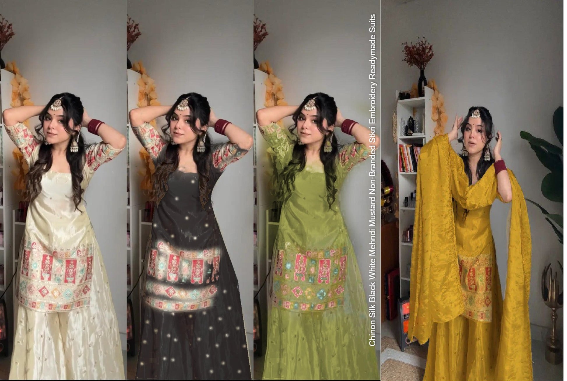 Chinon Silk Black White Mehndi Mustard Non-Branded Stkri Embroidery Readymade Suits